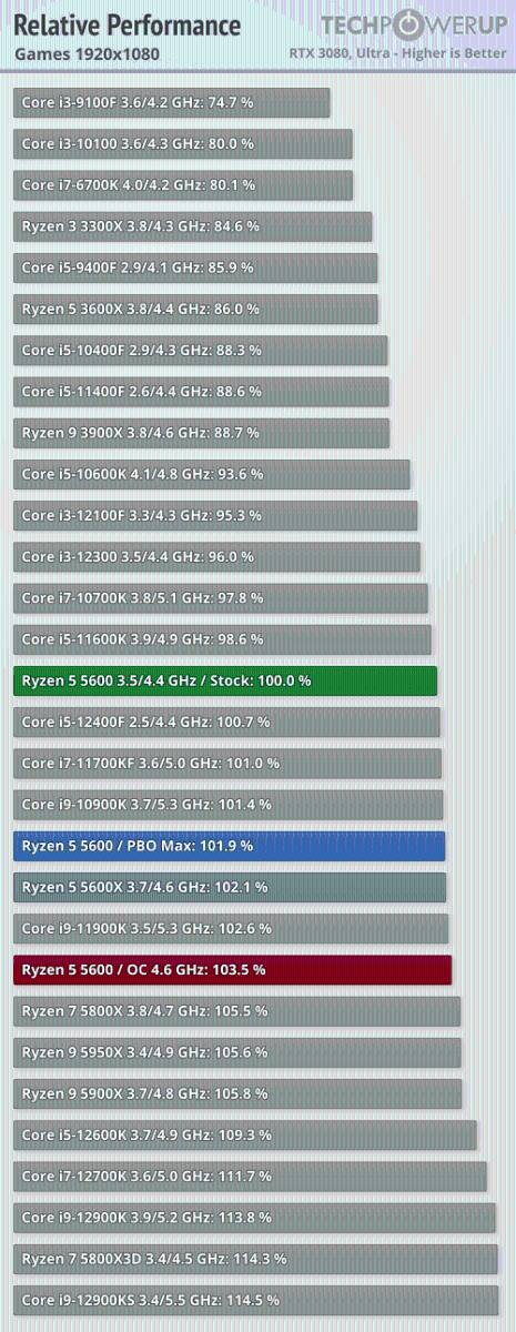 А вот Ryzen 5 5600X в версии OEM стоит всего 14270 рублей и именно его можно назвать лучшим кандидатом для апгрейда старых систем AM4. Энергопотребление у процессора, если не задействовать технологию AMD Precision Boost Overdrive 2 (PBO2), очень небольшое и с ним справятся даже самые бюджетные материнские платы. Но если включить PBO2, то процессор показывает отличные результаты по производительности на ядро, глядя на которые даже не верится, что этому процессору уже два года.