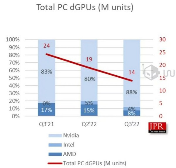 Но самое интересное из отчета Jon Peddie Research - это данные о том, как обстоят дела в извечном противостоянии на рынке дискретных видеокарт компаний AMD и NVIDIA. Компании NVIDIA удалось захватить львиную долю рынка, которая составляет 88%. А количество видеокарт AMD на рынке уменьшилось за год с 17% до скромных 8%, и еще 4% занимает продукция Intel, которая представлена новыми видеокартами Intel Arc.