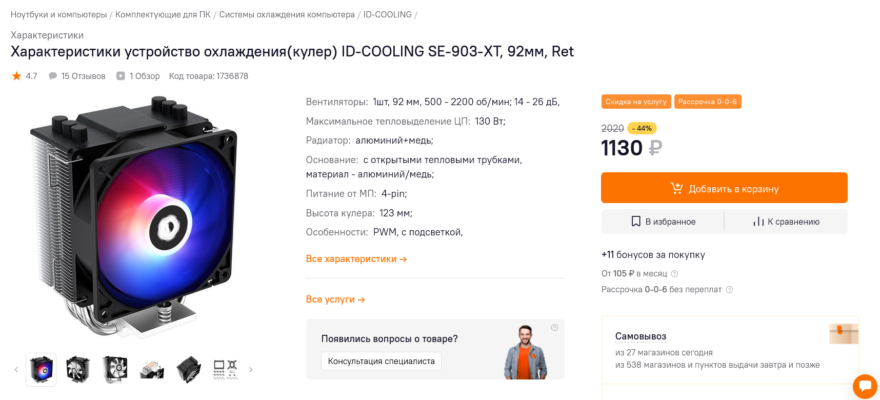 Охлаждать наш Core i5-12400F будет кулер ID-COOLING SE-903-XT, который способен отвести от процессора 130 ватт тепла. ID-COOLING SE-903-XT имеет три теплотрубки диаметром 6 мм с технологией прямого контакта, вентилятор с подсветкой диаметром 92 мм, на гидроподшипнике с технологией регулировки оборотов PWM, и простое и удобное крепление.