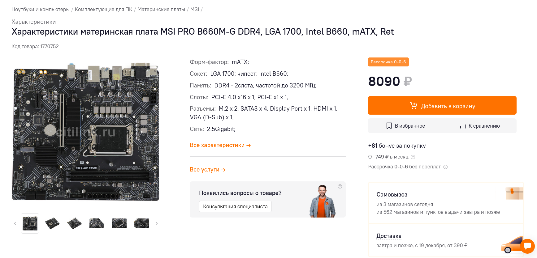 В эту сборку мы возьмем плату MSI PRO B660M-G DDR4, одну из самых недорогих плат на чипсете Intel B660. Главная проблема подобных плат - экономия на охлаждении системы питания процессора, из-за чего на ней отсутствуют радиаторы. И это при том, что сама система питания качественная и количества фаз с избытком хватит для Core i5-12400F. Но и брать в такую сборку более дорогую плату, сопоставимую с ценой процессора - очень нерационально. В остальном у MSI PRO B660M-G DDR4 есть все, что нужно игровому ПК: разгон ОЗУ, два разъема M.2 и радиатор для SSD, шустрая сеть на 2.5 гигабита, и армированный слот под видеокарту.