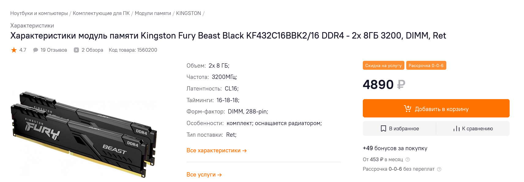 Рост цен пока еще не затронул оперативную память и отличный комплект из пары модулей общим объемом 16 ГБ Kingston Fury Beast Black KF432C16BBK2/16 можно купить всего за 4890 рублей. Память имеет частоту 3200 МГц и тайминги с формулой 16-18-18. А вот какие чипы попадутся в конкретном комплекте - это лотерея, как и разгонный потенциал. Но даже частоты в 3200 МГц вполне достаточно для Core i5-12400F в играх. Стоит отметить и очень длительный срок гарантии в 10 лет.