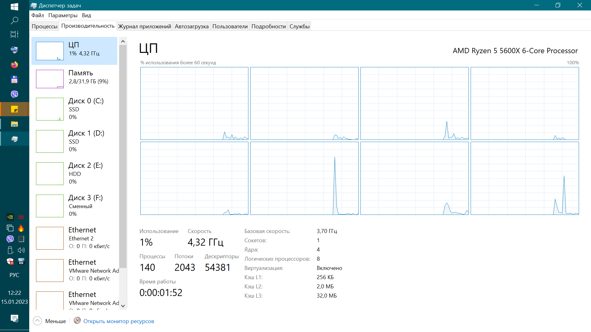 После этого, перезагрузив ПК, можно увидеть, что в Windows теперь только восемь потоков в Диспетчере задач.