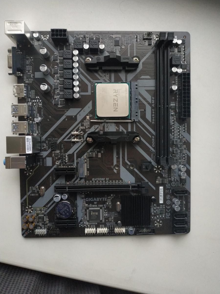 Я купил материнскую плату GIGABYTE B450M H, которая уже не продается в Ситилинке, но в продаже все еще есть ее аналог — GIGABYTE B450M K. Это типичная бюджетная плата — нет радиаторов на цепях питания, есть минимум нужных портов и разъемов для вентиляторов, но распаковав ее, я поразился, насколько тонкий у нее текстолит. Он настолько тонок, что страшно не только устанавливать на плату кулер и втыкать разъем питания 24-пин, но даже устанавливать модули ОЗУ. Плата заметно прогибается, и я для безопасности подложил во все критичные места кусочки поролона между платой и корпусом.