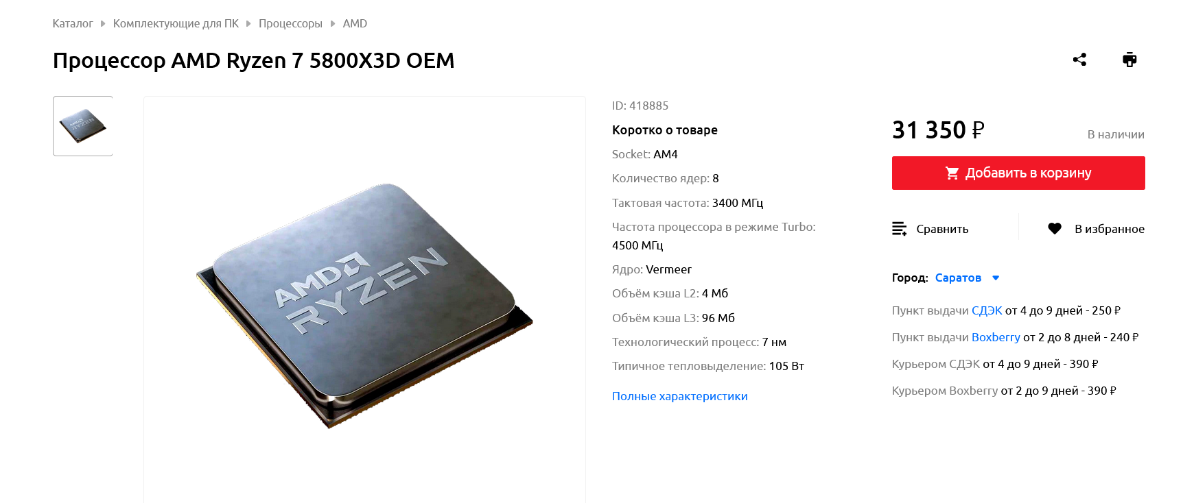 Ryzen 7 5800X3D понемногу дешевеет и уже стоит чуть дороже 30000 рублей.