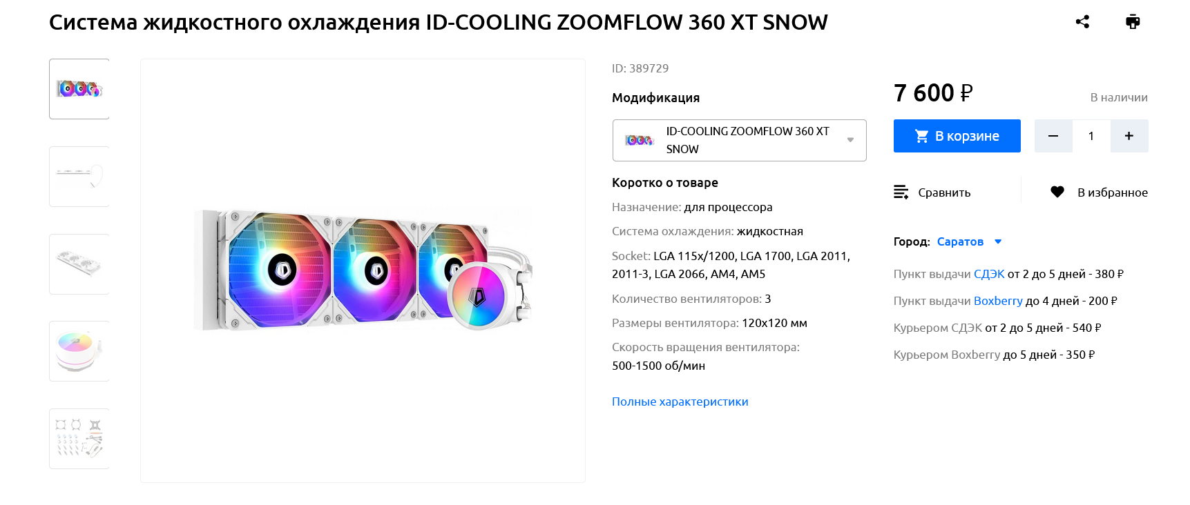 Для охлаждения процессора мы возьмем трехсекционную систему жидкостного охлаждения ID-COOLING ZOOMFLOW 360 XT SNOW, способную отвести 350 ватт тепла.