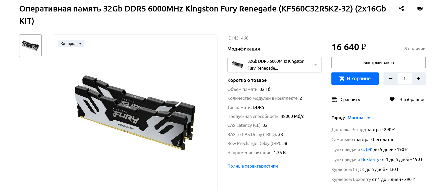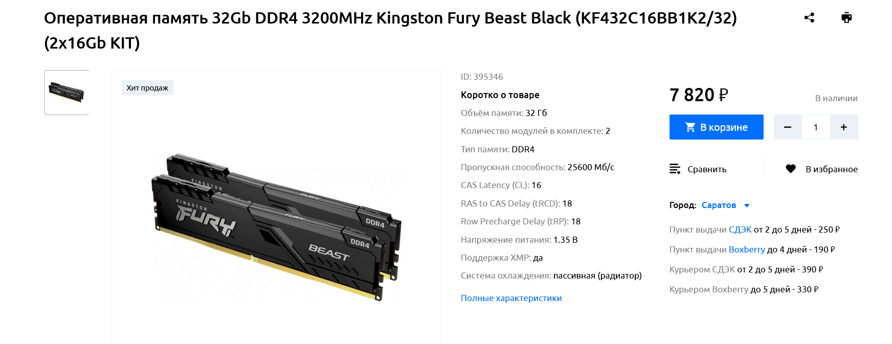 Можно уверенно говорить, что уже пришло время, когда в игровой компьютер обязательно нужно ставить 32 ГБ оперативной памяти. Мы возьмем пару популярных модулей Kingston Fury Beast Black (KF432C16BB1K2/32), с частотой 3200 МГц и формулой таймингов 16-18-18-36.