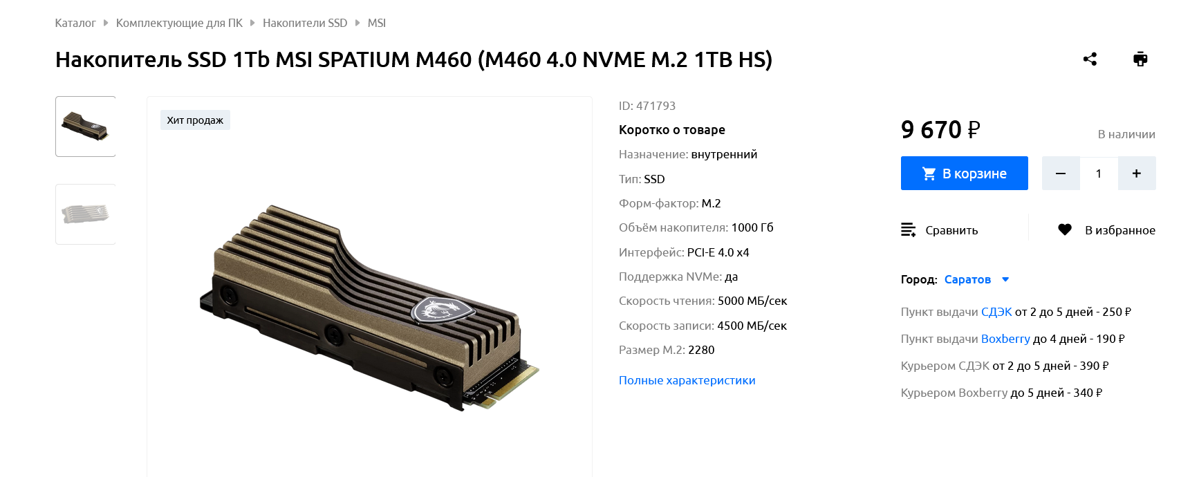 Компьютеру такого серьезного уровня как наш, требуется соответствующий SSD-накопитель и мы возьмем быстрый SSD MSI SPATIUM M460 объемом 1 ТБ. Отличные скоростные характеристики у MSI SPATIUM M460 дополняются крупным радиатором и вам не придется дополнительно искать радиатор для накопителя и заниматься его установкой.