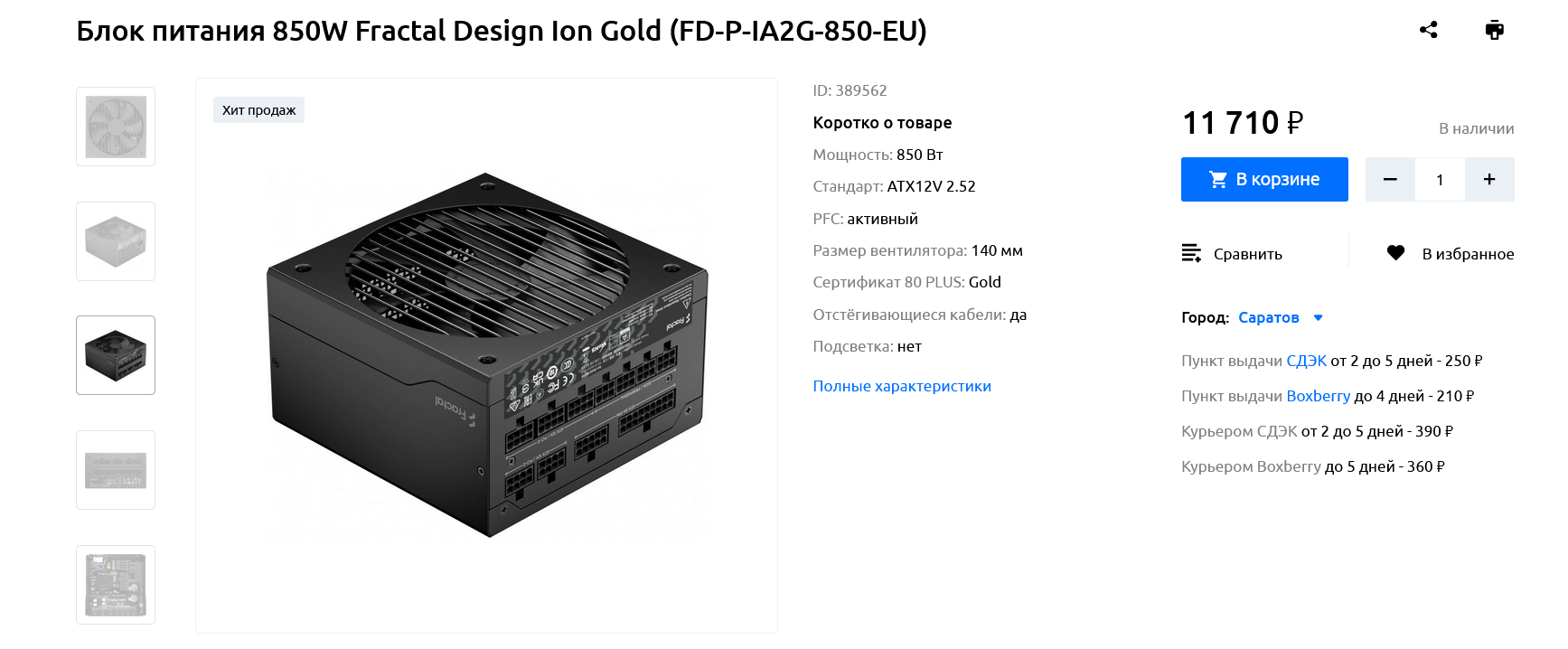 GeForce RTX 4070 Ti с энергопотреблением в 285 ватт требует мощного блока питания на 750 ватт и более, и мы возьмем Fractal Design Ion Gold мощностью 850 ватт. Это надежный блок питания с сертификатом 80 PLUS Gold, современной схемотехникой и очень тихой работой при нагрузке до 400-500 ватт. А примерно столько и будет потреблять наш компьютер в играх.
