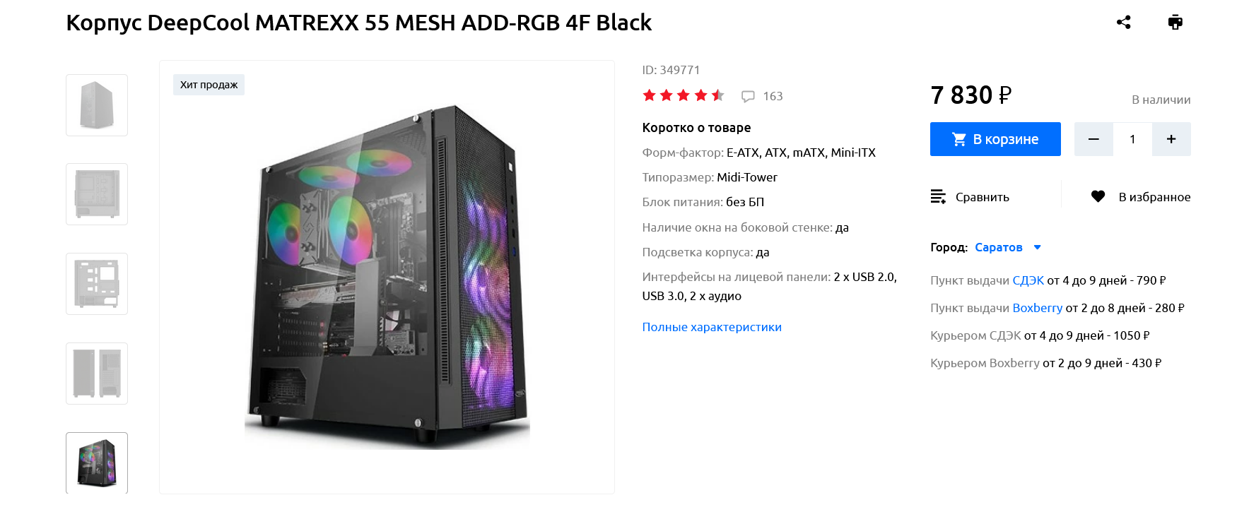 Для нашей сборки потребуется отлично продуваемый корпус, ведь в играх придется отводить из него более 400 ватт тепла. Мы возьмем DeepCool MATREXX 55 MESH ADD-RGB 4F Black, просторный и стильный корпус с четырьмя предустановленными вентиляторами, которым будут помогать три вентилятора на СЖО COOLING ZOOMFLOW 360 XT SNOW, которую можно будет поставить на верх корпуса.