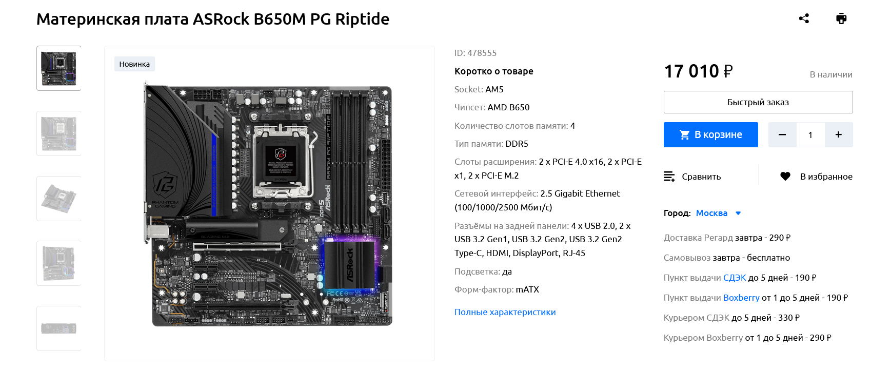 Но, взглянув на цены материнских плат AM5, понимаешь, что сборка на Ryzen 7 7700X будет заметно дороже. Мы возьмем плату ASRock B650M PG Riptide на чипсете AMD B650, типичного середнячка с хорошим оснащением, чья система питания легко справится с Ryzen 7 7700X.