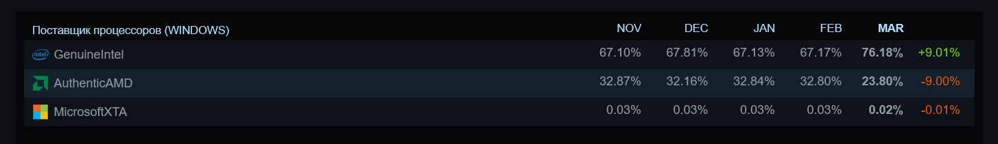 Это подтверждает и независимая статистика, например, от сервиса Steam, которая показывает, что процессоров от AMD у пользователей совсем немного — всего 23% и это число продолжает стремительно сокращаться, а вот у конкурента, Intel — растет.