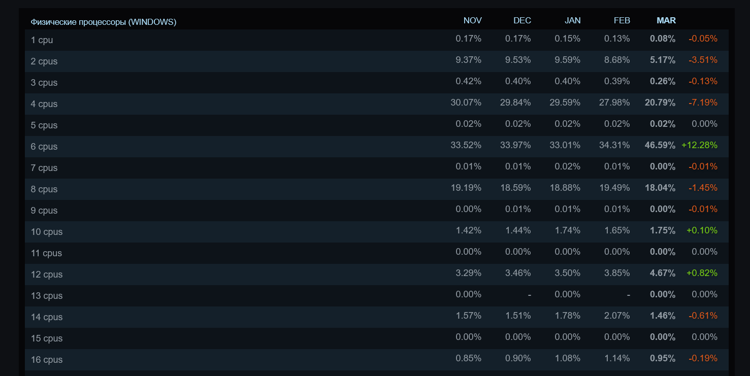 Интересна и статистика по количеству ядер процессоров, которая показывает, что массовыми стали шестиядерные модели с долей 46%, четырехъядерных — 20%, а вот восьмиядерных всего 18%. Еще меньше процессоров с большим количеством ядер, например, 16-ядерных всего 0.95%.