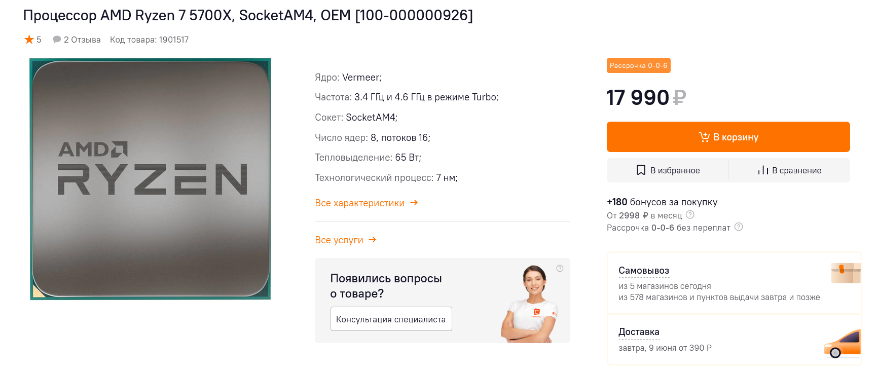 Второй по важности вопрос — какой процессор выбрать в пару к GeForce RTX 4070? Шестиядерный Ryzen 5 5600X будет не самым оптимальным выбором, мощный Ryzen 5 7600X подешевел, но очень горяч и требует дорогой материнской платы и ОЗУ, а Core i5-13400F мало ушел в производительности от старого-доброго Core i5-12400F. Поэтому я предлагаю взять восьмиядерный Ryzen 7 5700X, холодный процессор, который при желании можно разогнать до уровня Ryzen 7 5800X.
