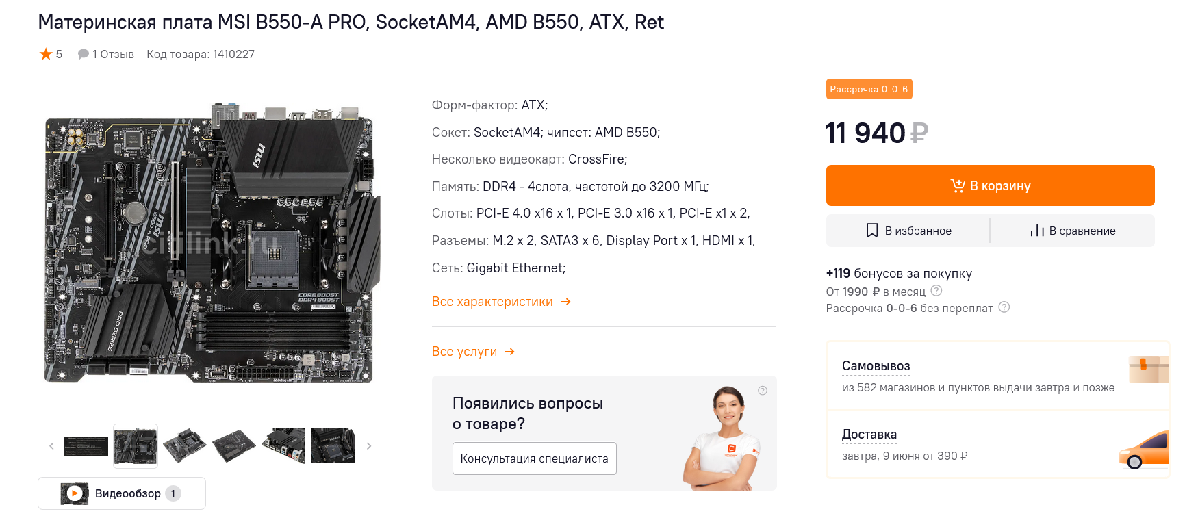 Экономить на материнской плате в такой мощной сборке не стоит и мы возьмем MSI B550-A PRO, продвинутую модель на чипсете AMD B550, с качественной системой питания с мощными радиаторами, парой портов M.2 и, конечно же, с шиной PCI Express 4.0, без наличия которой не стоит делать мощные сборки в 2023 году.