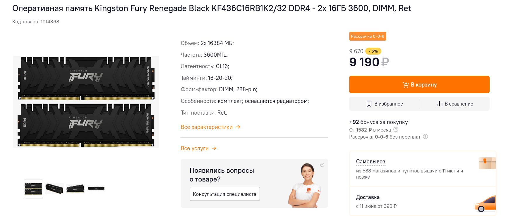 Если вы хотите не ошибиться с выбором памяти для Ryzen 7 5700X, то смотрите в сторону модулей с частотой, как минимум, 3600 МГц и таймингом CL, равным 16 — они не будут ограничивать производительность процессора. Например, Kingston Fury Renegade Black KF436C16RB1K2/32. И конечно же, в мощный ПК в 2023 году стоит брать 32 ГБ ОЗУ, ведь некоторые новые игры уже перевалили в потреблении за объем в 16 ГБ.