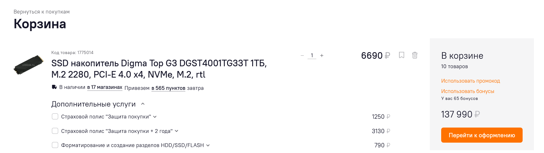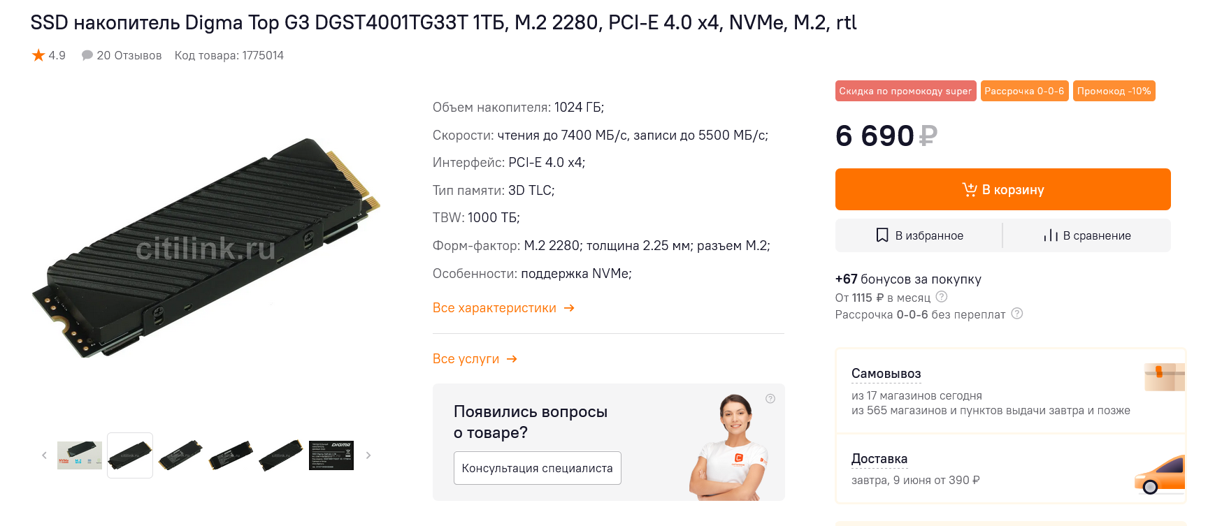 В наш ПК мы установим SSD-накопитель Digma Top G3 DGST4001TG33T объемом 1 ТБ, быстрый, надежный и с неплохим предустановленным радиатором. А если захотите установить в сборку еще один SSD, то у материнской платы есть для него радиатор.