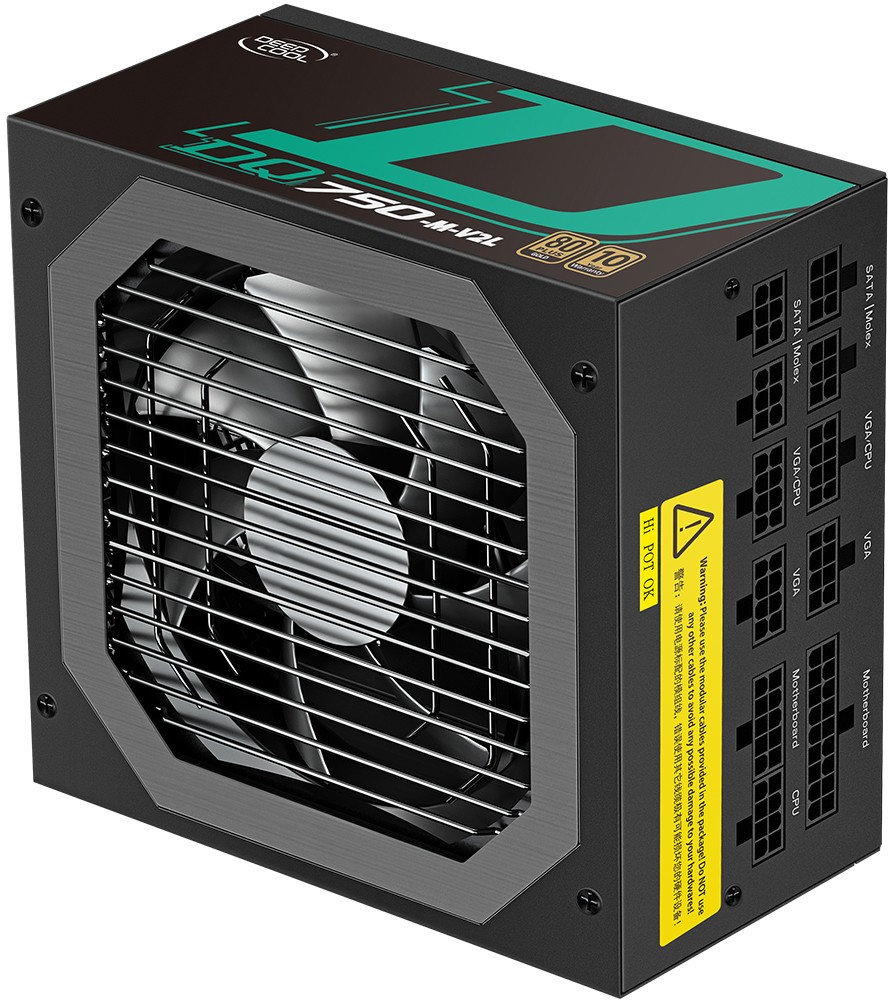 Чтобы подобрать тихий блок питания в нашу сборку, пришлось пересмотреть немало обзоров и я остановился на модульной модели DeepCool DQ750-M-V2L, мощностью 750 ватт и с сертификатом 80 PLUS GOLD. БП построен по современной схеме с использованием LLC-резонанса и использует раздельную стабилизацию напряжений, имеет все необходимые защиты, а вентилятор в нем вращается всего на 900 с небольшим оборотах в минуту вплоть до нагрузки в 80%. Так что в нашей сборке этот блок питания всегда будет тихим.