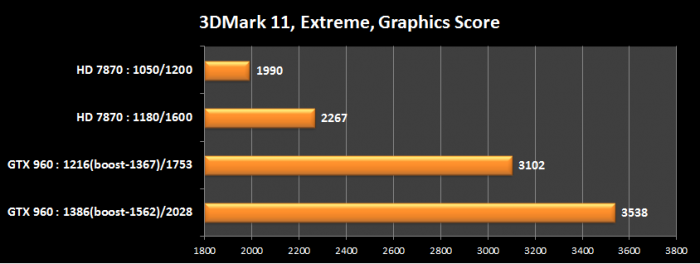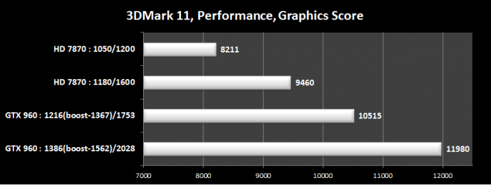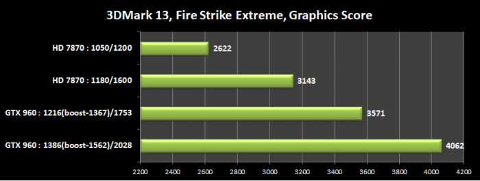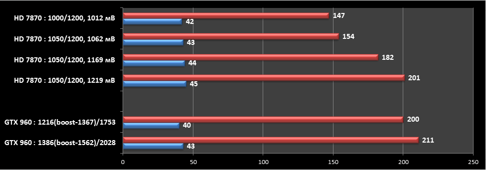 И тут у меня в голове промелькнула мысль, что я сделал не правильную покупку. Но потом ко мне вернулись дар речи и я вспомнил, что стресс-тест на то и стресс, чтобы показать все аппетиты карты + тест от MSI на карте MSI с биосом MSI. Грубо говоря для своего продукта тест жесткий. Я решил пройтись по бенчмаркам и играм, карты тестировались на эталонных показателях: для HD 7870 — 1050\1200 МГц при 1.169 В и для GTX 960 — 1216\1753 МГц при 1.206 В. Вот что вышло: