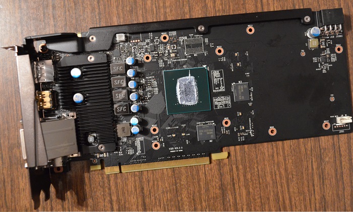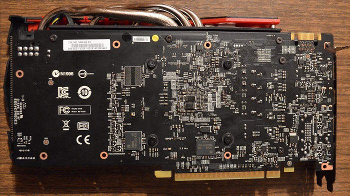 Если судить по обратной стороне, то видно, что печатная плата имеет ту же длину, что и система охлаждения. Мне это как-то тоже больше нравится, чем у моделей Palit с их решетками. А вот выступающие тепловые трубки можно посчитать недостатком для некоторых: ширина же возросла в сравнении с задней панелью видеовыходов.