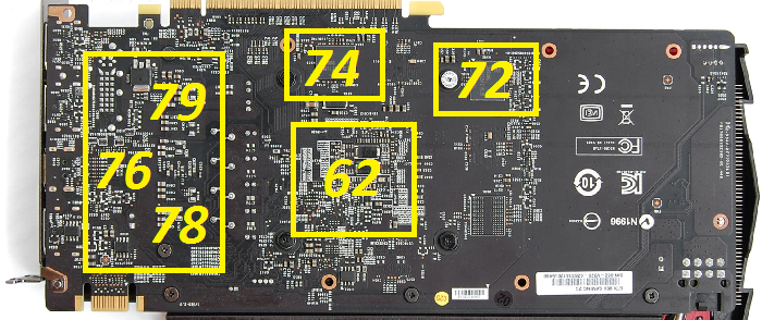 Как видите в полном пассиве температура микросхем памяти и подсистемы питания куда выше температуры ядра, однако, эти значения далеки от катастрофических. Память может комфортно себя чувствовать до 100*С, а силовые элементы рассчитаны до 110*С. От себя скажу, что я не переживаю по поводу длительных нагрузок на видеокарту с температурой до~90*С.