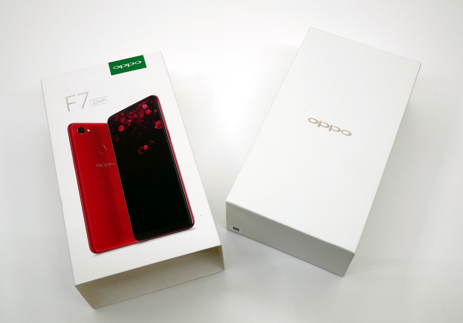 OPPO F7 поставляется в небольшой белоснежной упаковке с изображением смартфона в нескольких ракурсах и характерным логотипом производителя.