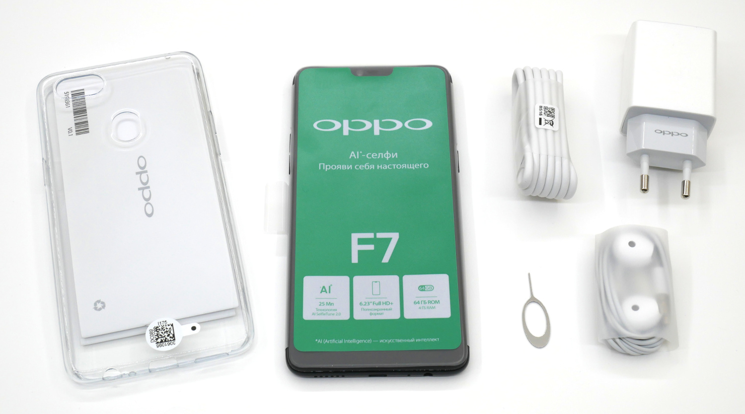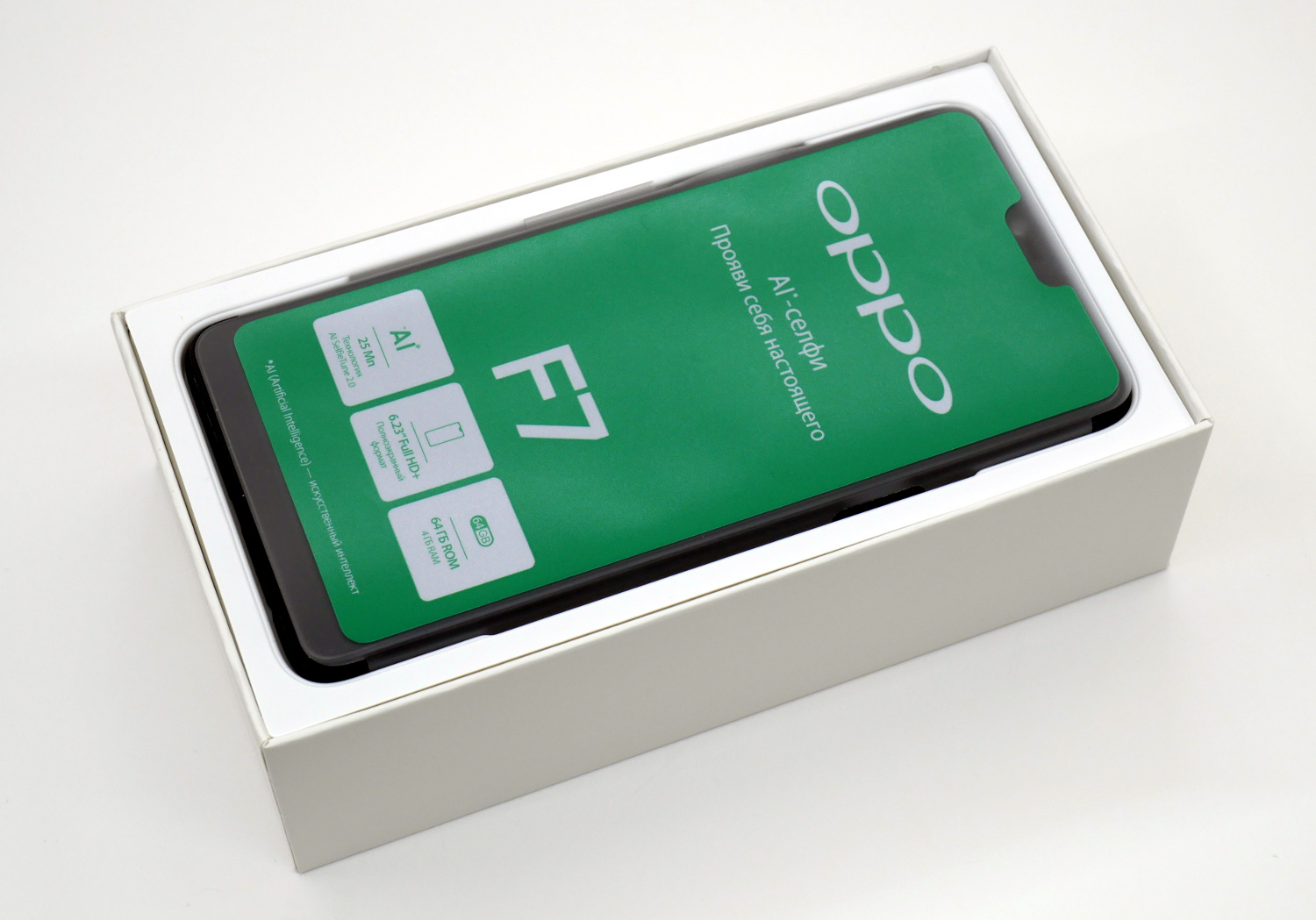 Коробка разделена на несколько секций, верхнюю занимает OPPO F7 в защитной пленке.