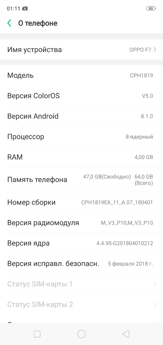 OPPO F7 работает под управлением последней версии Android 8.1 Oreo, но со своей фирменной оболочкой ColorOS v5.0. Внешние и внутренние изменения со стоковой ОС внушительные, поэтому пользователю придется привыкать после перехода с "чистого" Андройда.