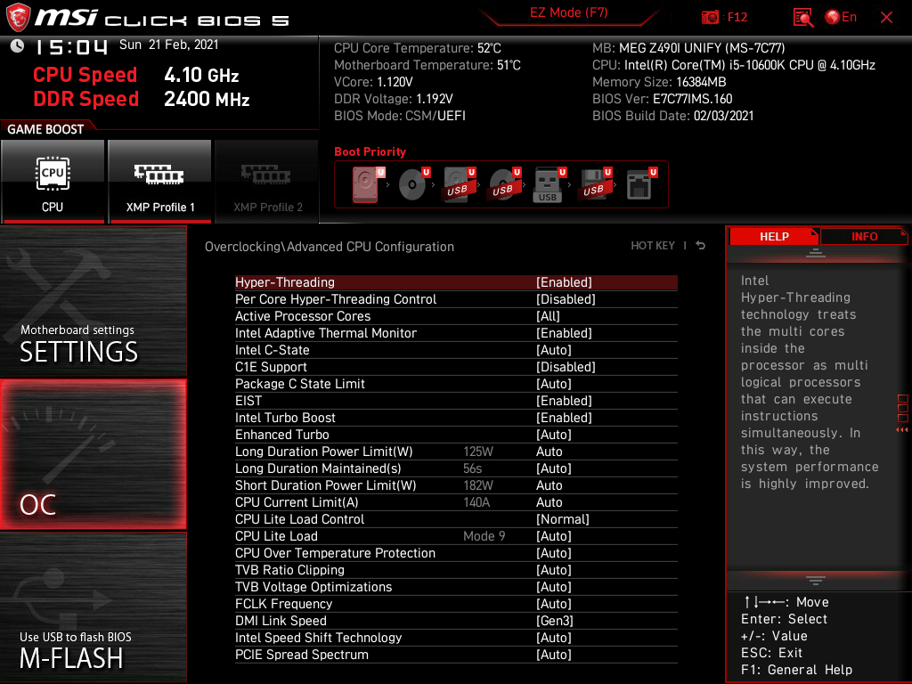 У плат MSI параметр за TDP указывают параметры Long Duration Power Limit (W) и Short Duration Power Limit (W), соответственно на первый кратковременный промежуток, пока процессор будет работать в бусте и на всем остальном этапе при полной нагрузке. Его и буду изменять.