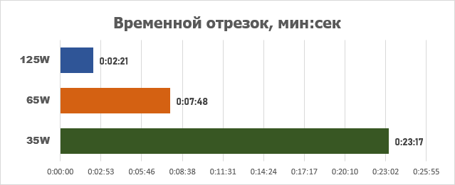 Сведу полученные результаты в единый график: на нем указано за сколько процессор прогревается до 100*С при полной нагрузке без обдува с кулером Arctic Cooling Alpine 12 Passive.