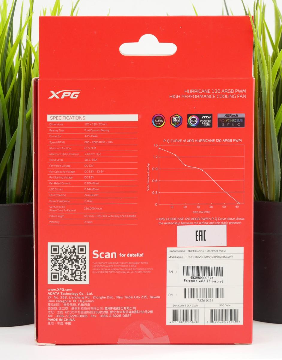 XPG Hurricane 120 ARGB PWM поставляется в фирменной красной упаковке с логотипом бренда девушки с именем Mera. Изображение продукта дает основное представление о внешнем виде модели.