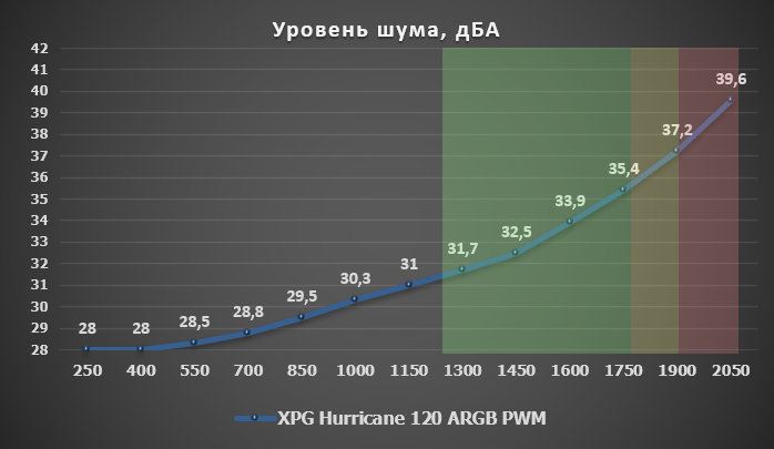 По уровню шума чудес не наблюдается, но общие результаты очень хорошие. Вентиляторы XPG Hurricane 120 ARGB PWM можно считать бесшумными до 900 об/мин, комфортными до 1550 об/мин, приемлемыми до 1800 об/мин и шумными при полной скорости.