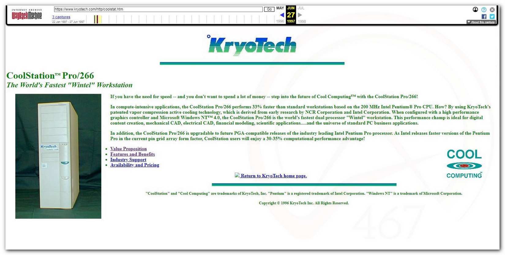 Его они представляли на ежегодной компьютерной и не только выставке, Comdex96 проходившей в 1996г. в Лас-Вегасе, порыскав по интернету увидел кучу статей о самом мероприятии, но там нет упоминаний о KryoTech, не потому что их там нет, видимо в то время на фриков не обращали внимания. Осталось несколько фото с выставки на самом сайте KryoTech. Comdex96.