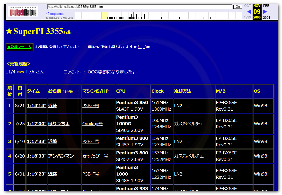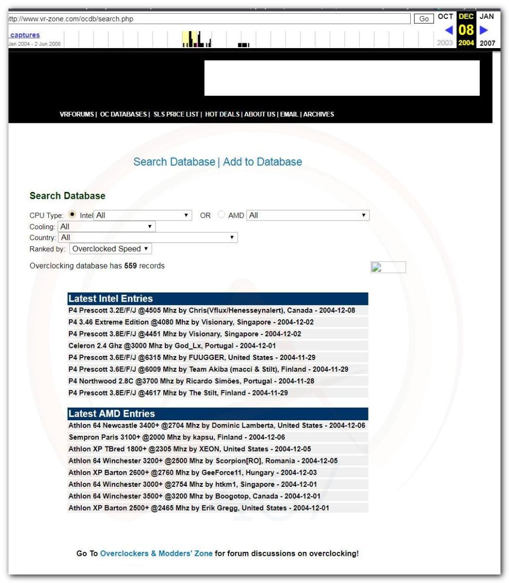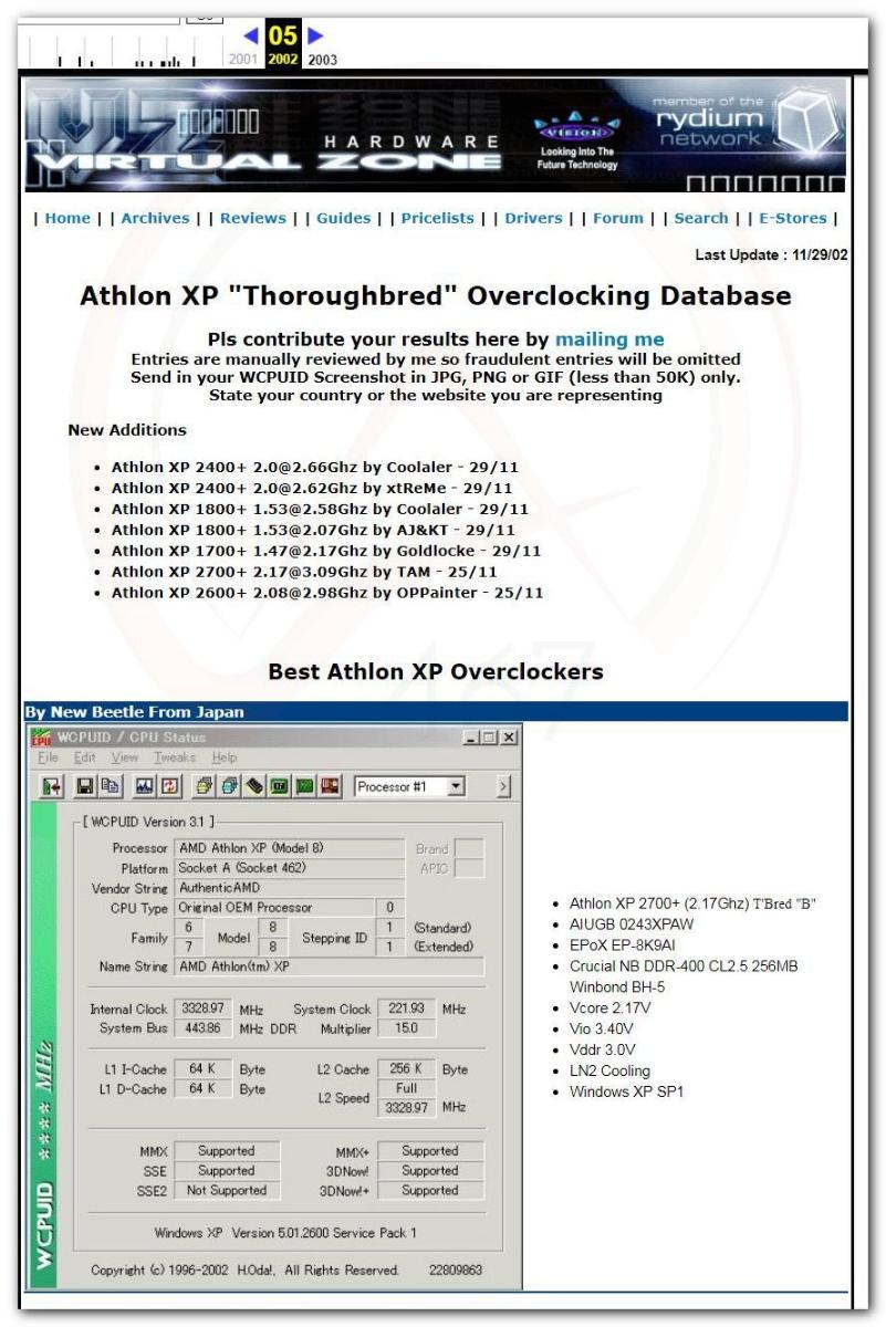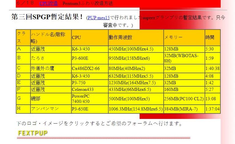 Первая база данных результатов разгона скорей всего была создана там же на сайте Nifty на странице FexTpup в 98-99г. как я не лазил по веб архиву, я не смог найти эту страницу. Но в интернете есть скрин в единственном экземпляре.