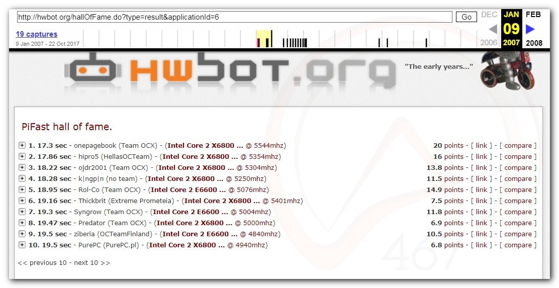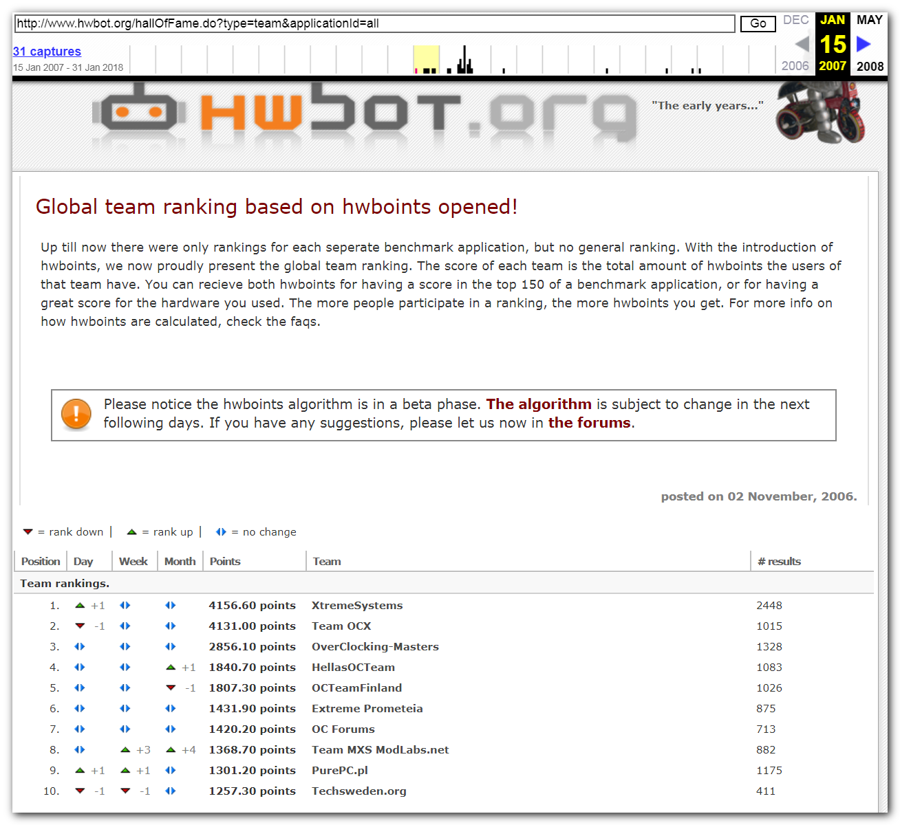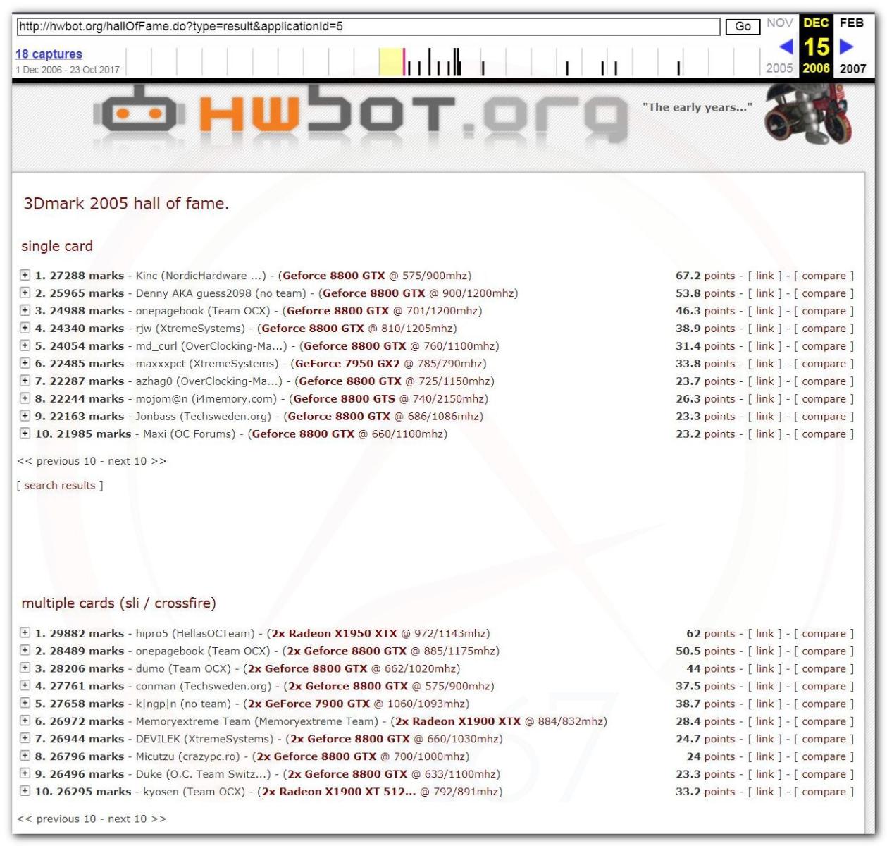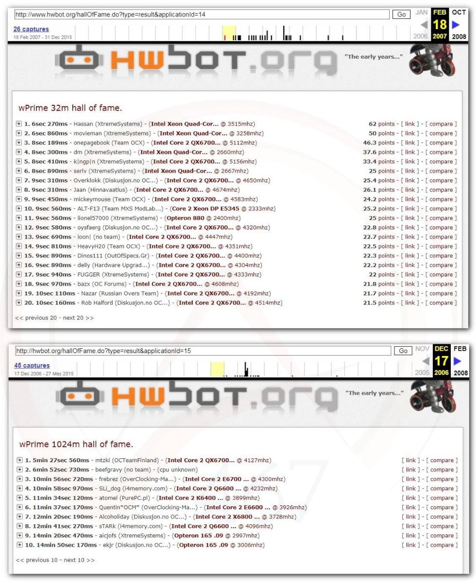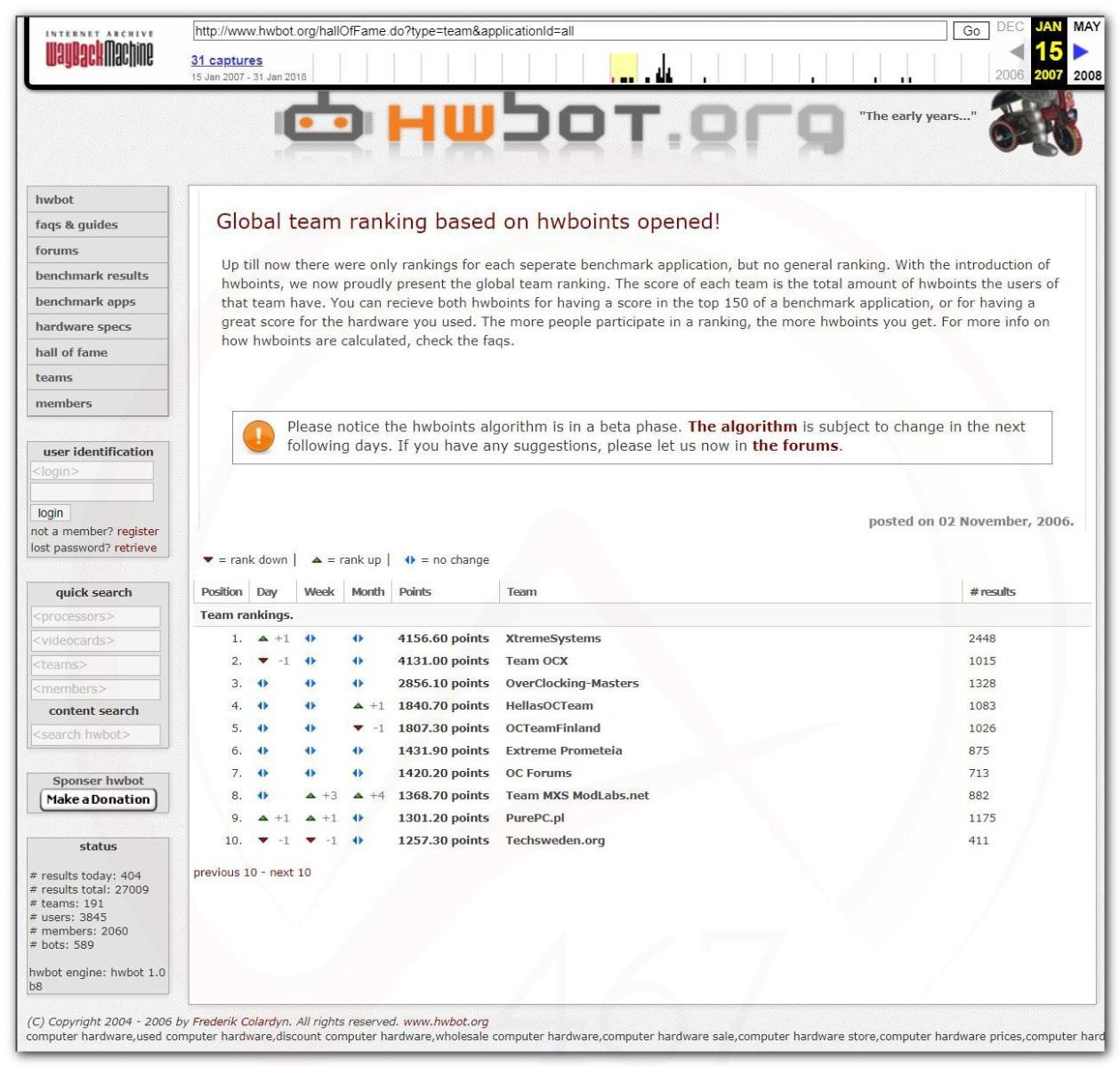 3 Ноября 2006 года, (Frederik richba5tard Colardyn) и остальные кто подключился к проекту Hwbot.org запускают первую ревизию ресурса. Регистрация некоторых команд была доступна немного раньше ещё в 2005 году, но тогда это была тестовая версия. Если не ошибаюсь сборная команда xtremesystems.org зарегистрировалась первой 20 апреля 2006 года.