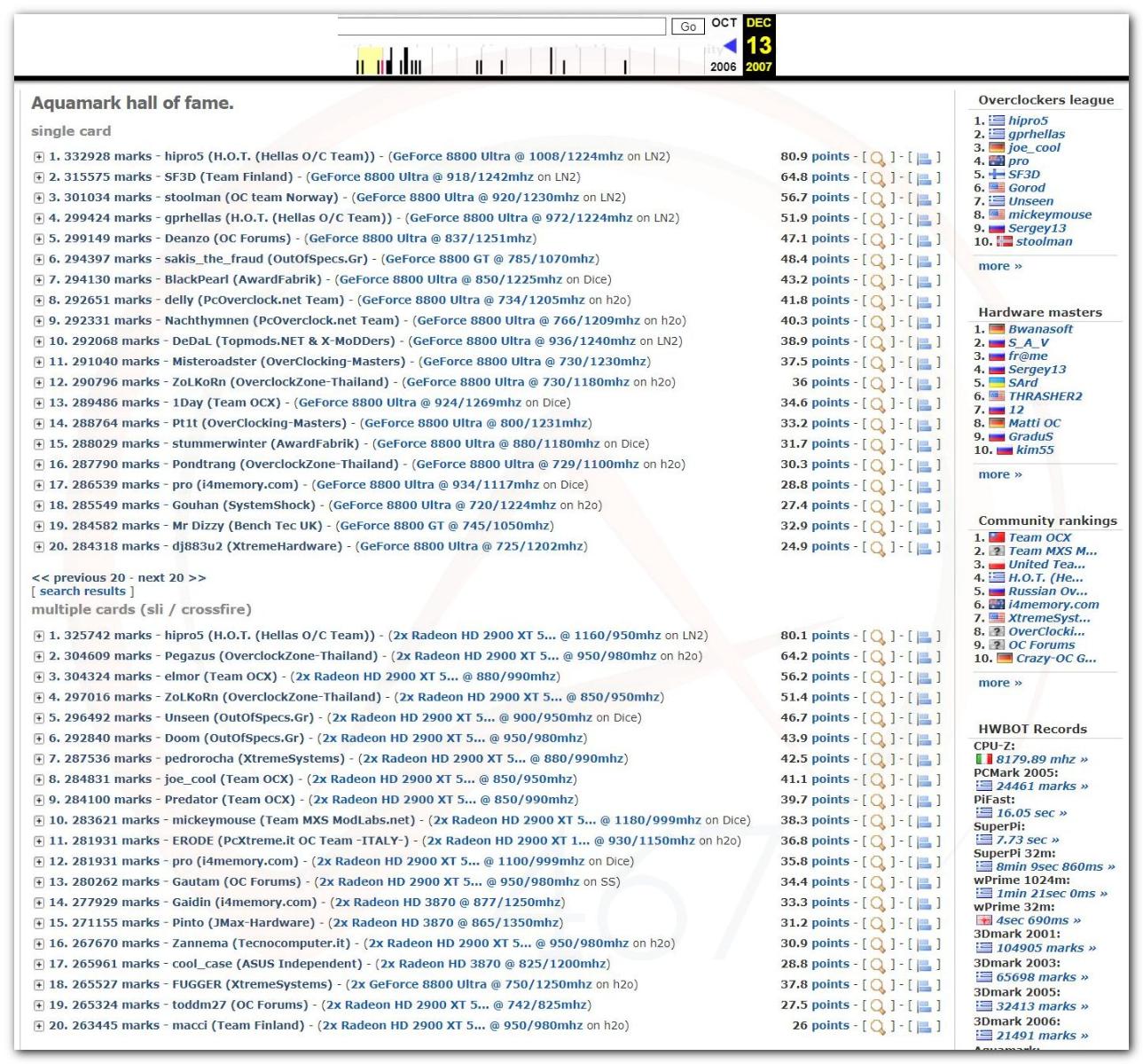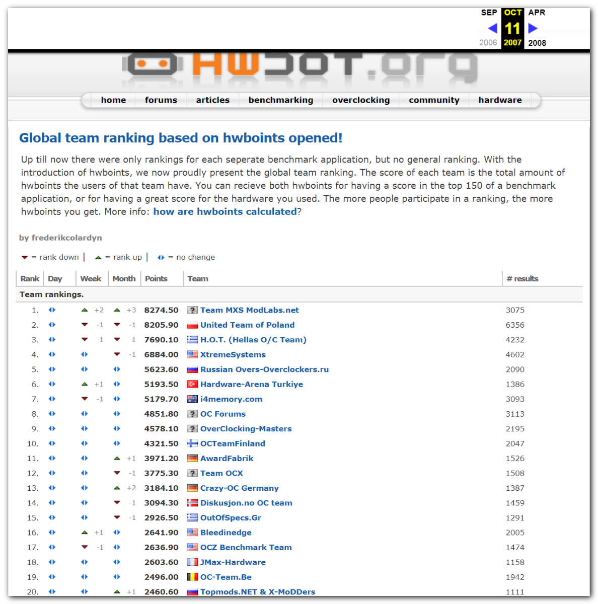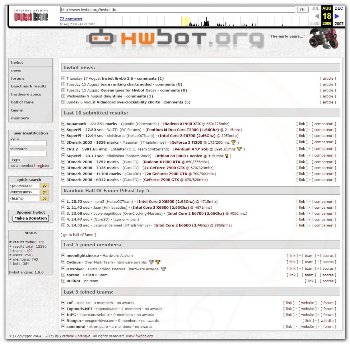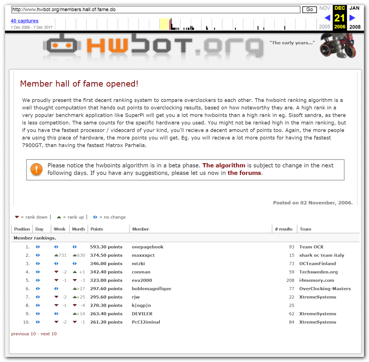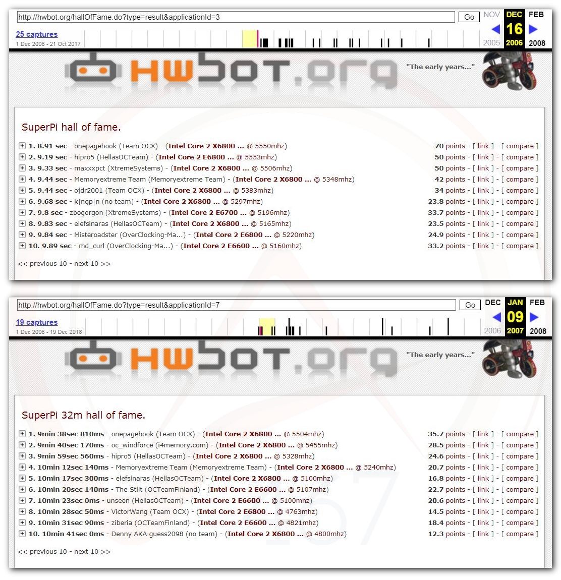 3 Ноября 2006 года, (Frederik richba5tard Colardyn) и остальные кто подключился к проекту Hwbot.org запускают первую ревизию ресурса. Регистрация некоторых команд была доступна немного раньше ещё в 2005 году, но тогда это была тестовая версия. Если не ошибаюсь сборная команда xtremesystems.org зарегистрировалась первой 20 апреля 2006 года.