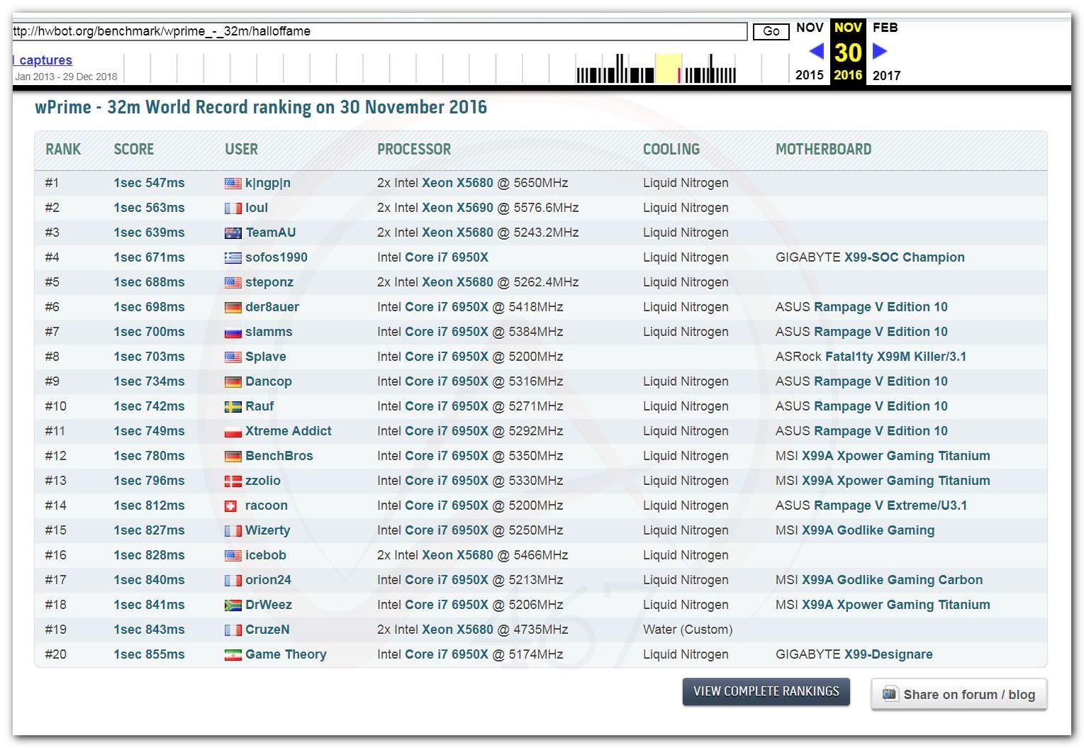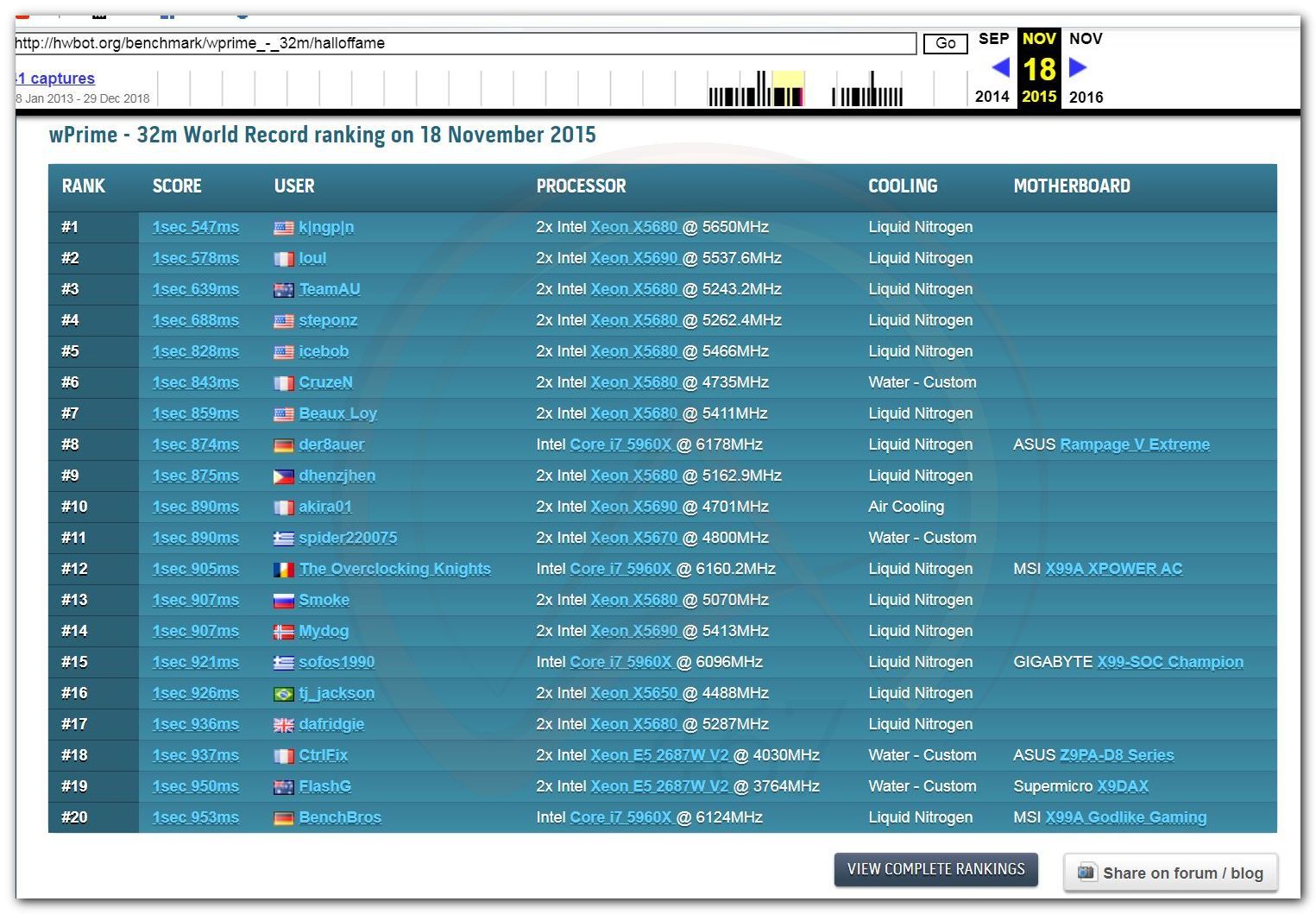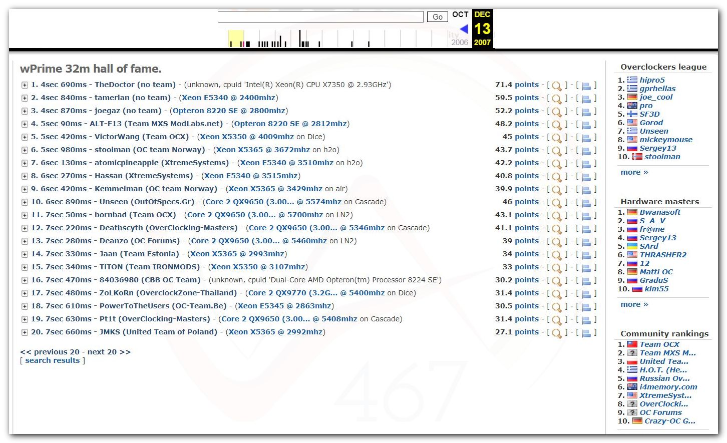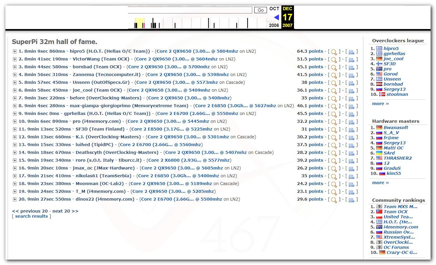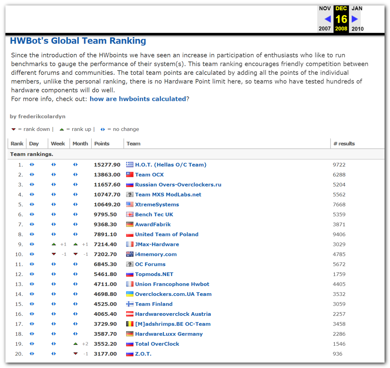 3 Ноября 2006 года, (Frederik richba5tard Colardyn) и остальные кто подключился к проекту Hwbot.org запускают первую ревизию ресурса. Регистрация некоторых команд была доступна немного раньше ещё в 2005 году, но тогда это была тестовая версия. Если не ошибаюсь сборная команда xtremesystems.org зарегистрировалась первой 20 апреля 2006 года.