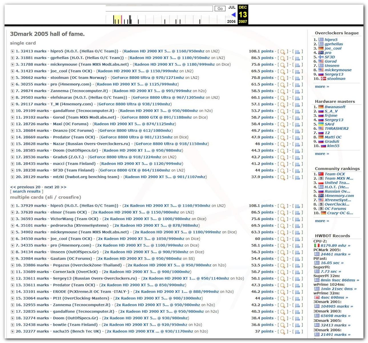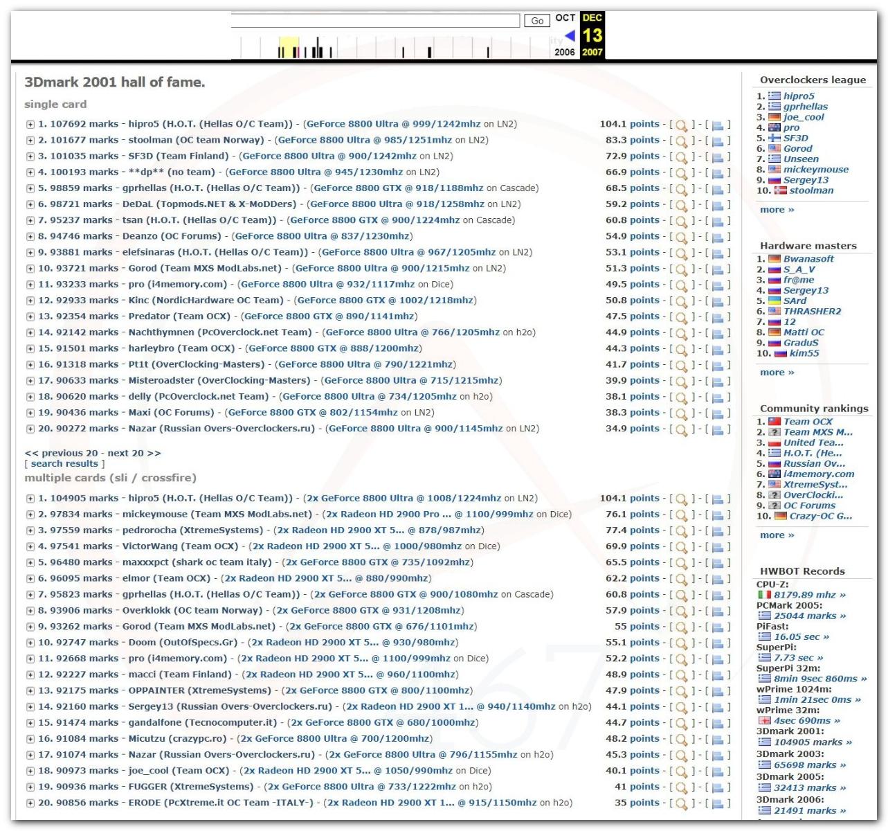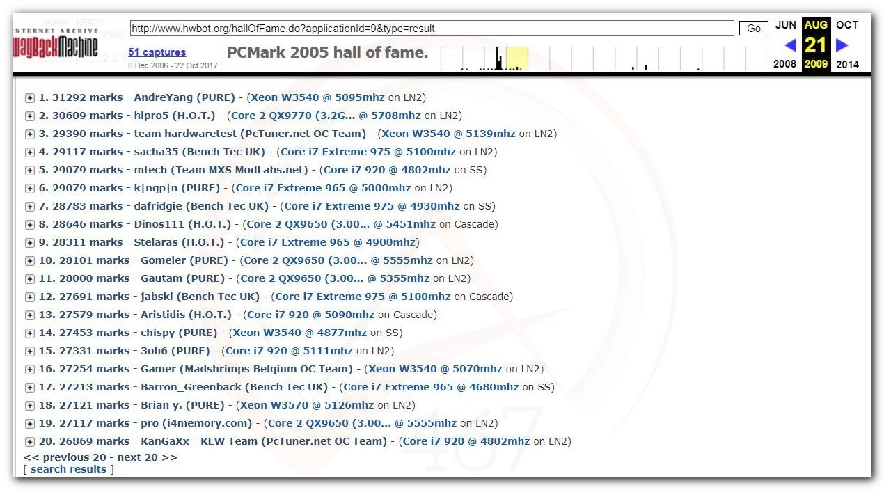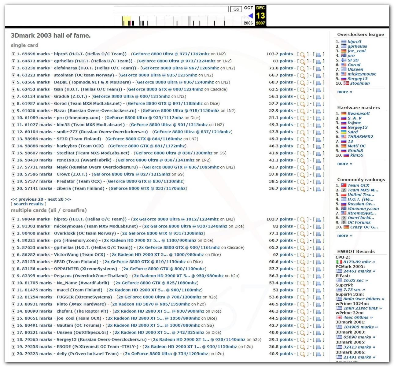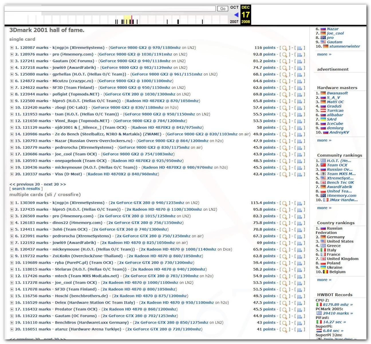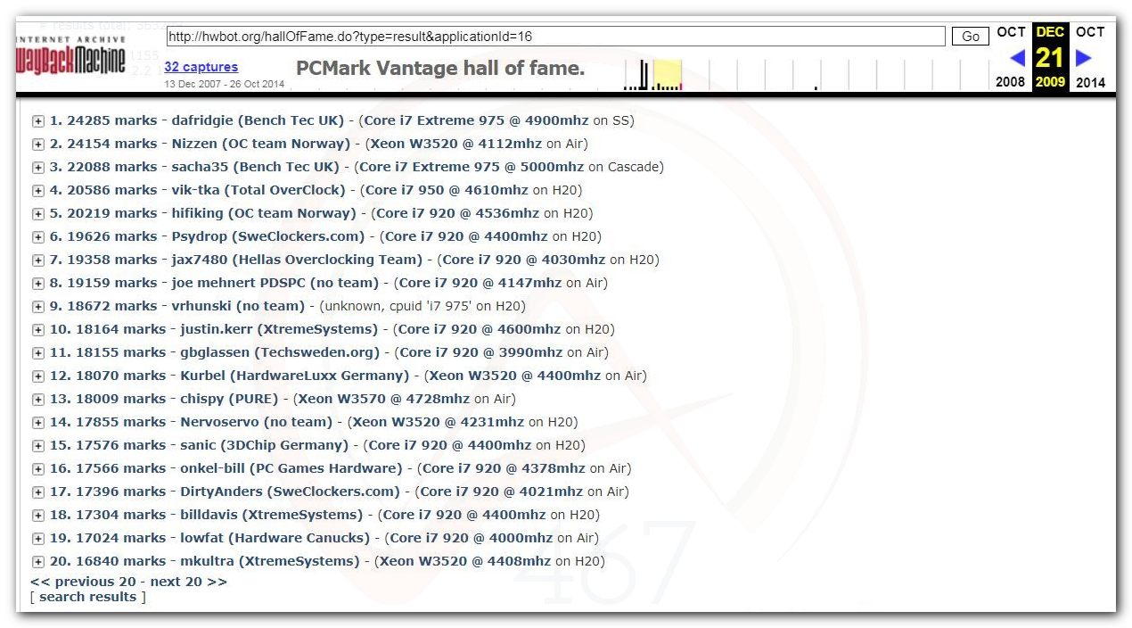 В 2000г. наверное самый бум наступил в момент появления 3DMark2000 и далее 2001, и создания базы этих результатов ORB на сайте MadOnion. В последствии перекочевала на Futuremark.