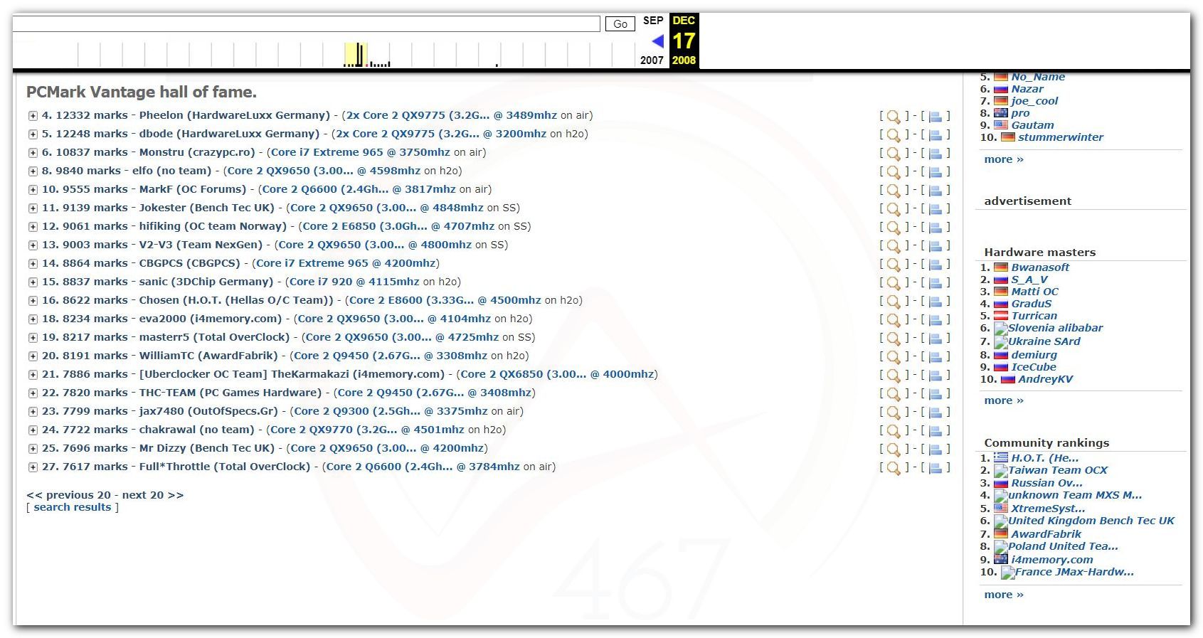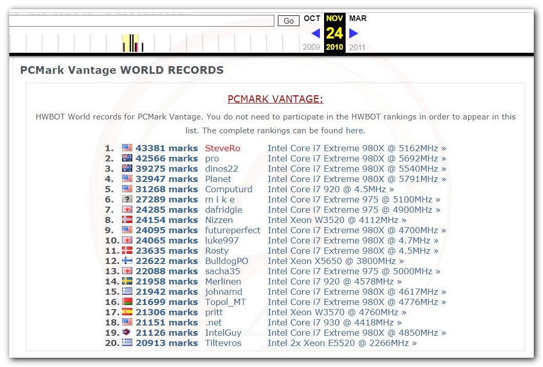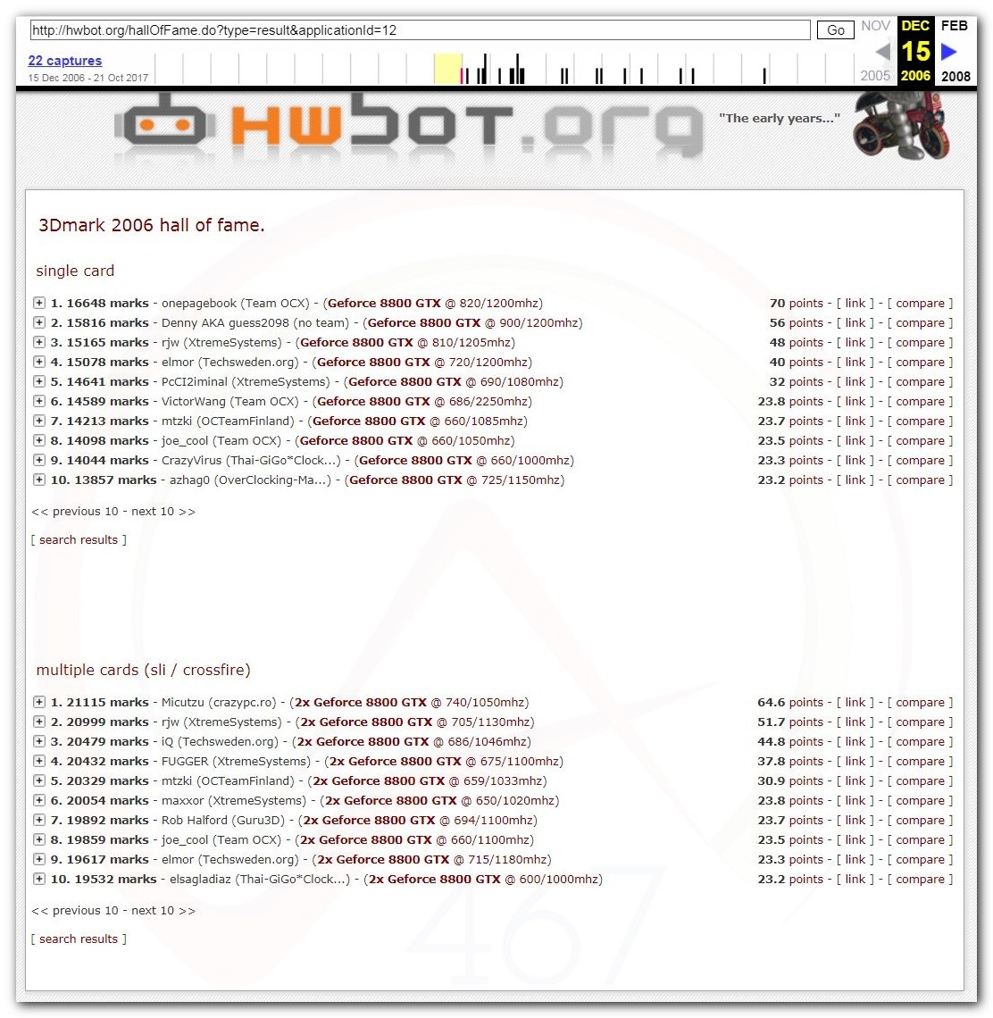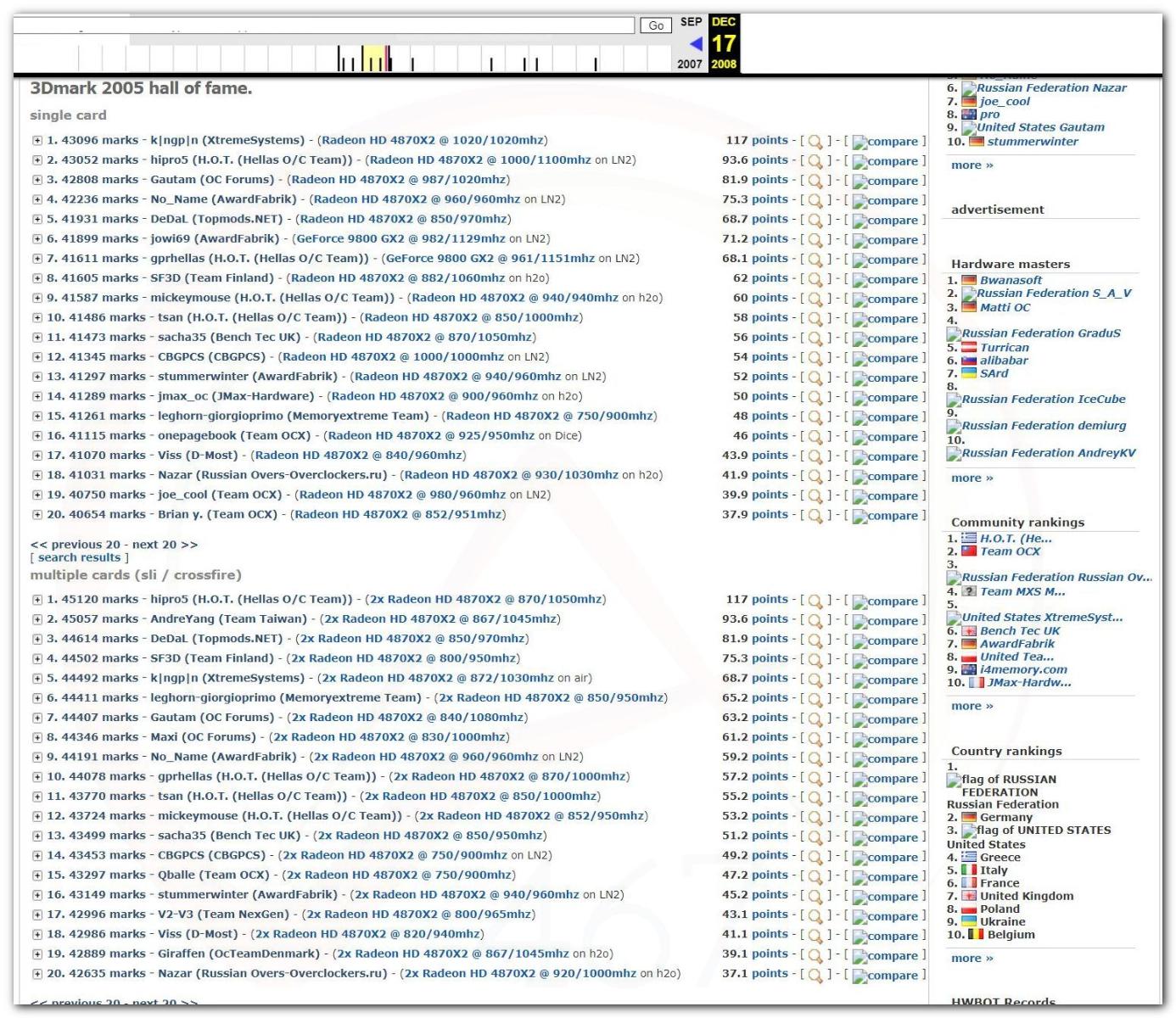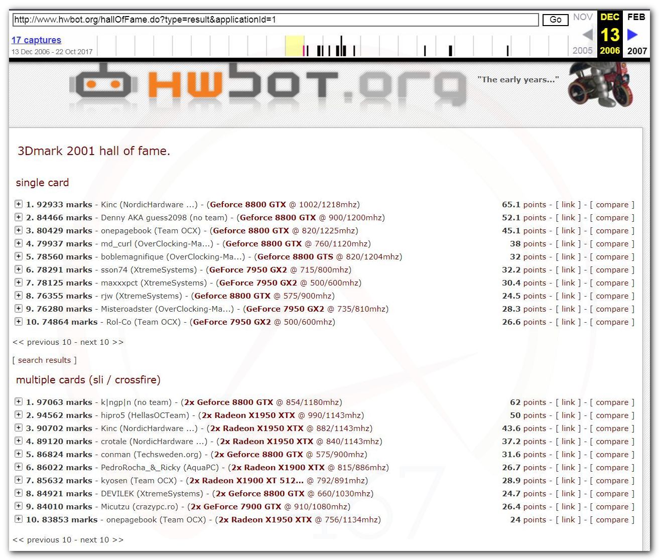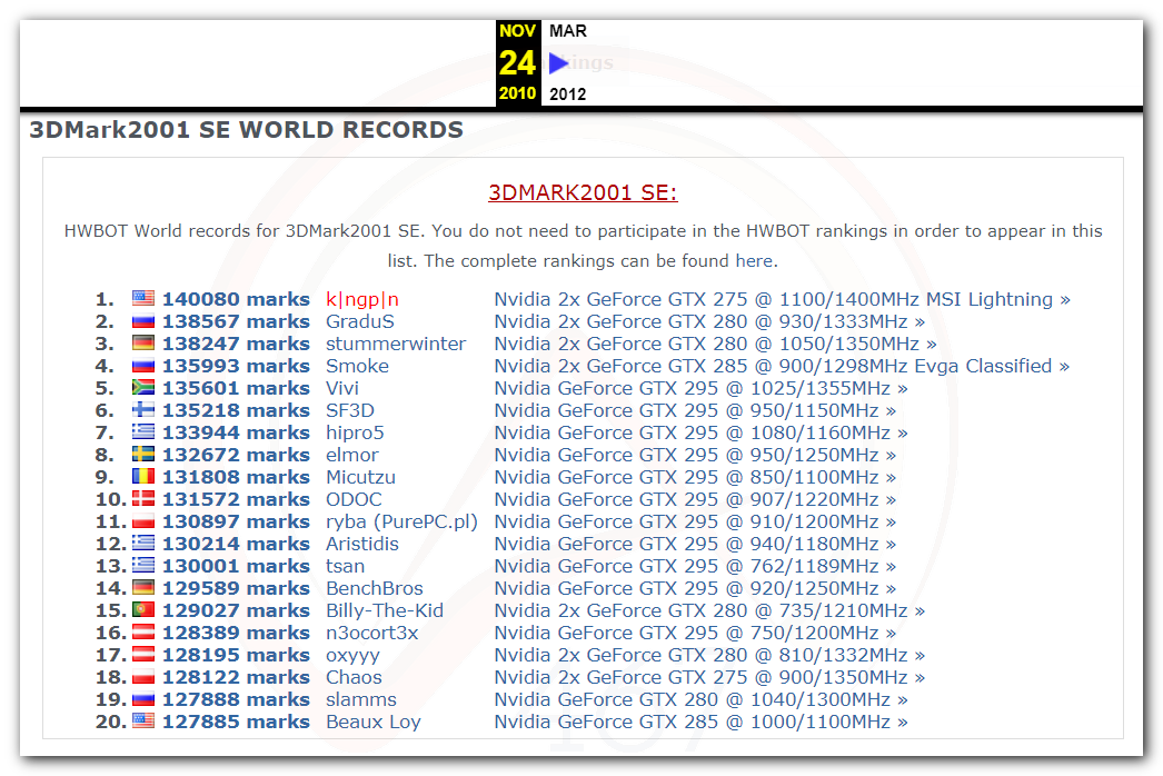 В 2000г. наверное самый бум наступил в момент появления 3DMark2000 и далее 2001, и создания базы этих результатов ORB на сайте MadOnion. В последствии перекочевала на Futuremark.