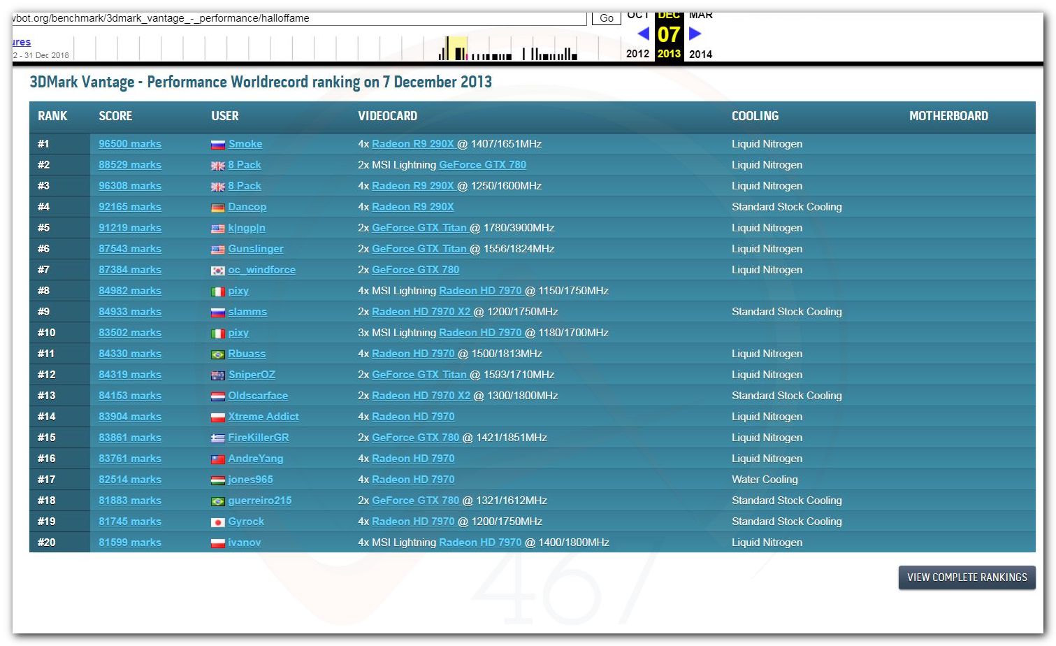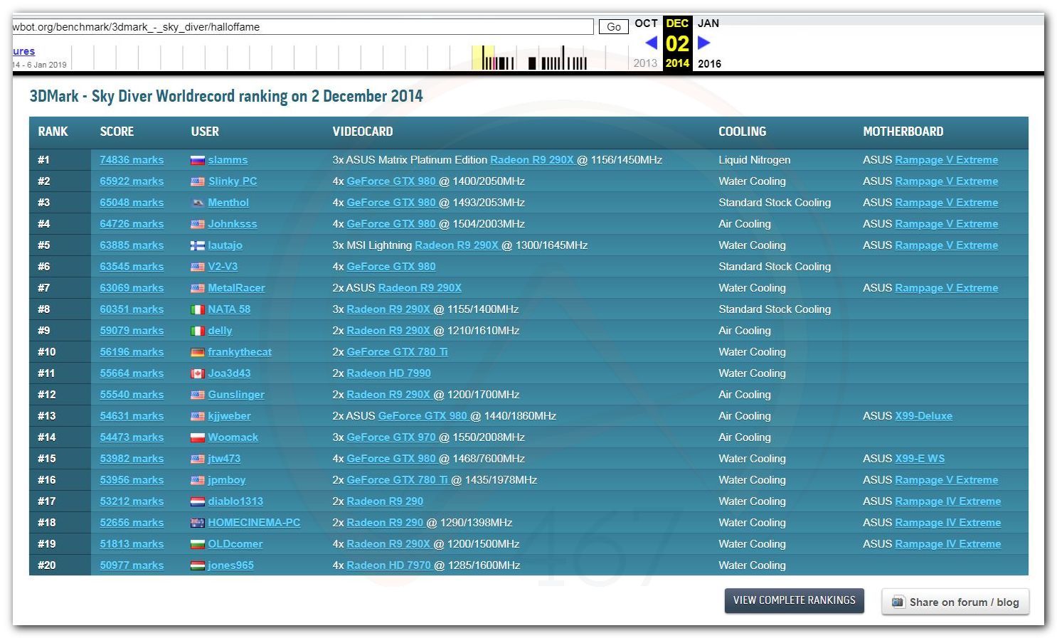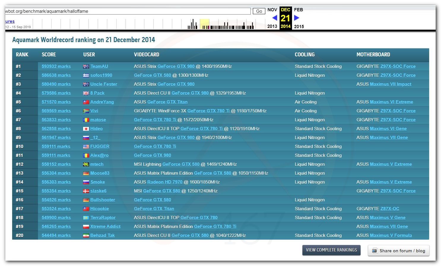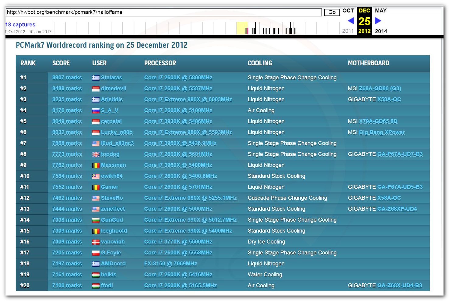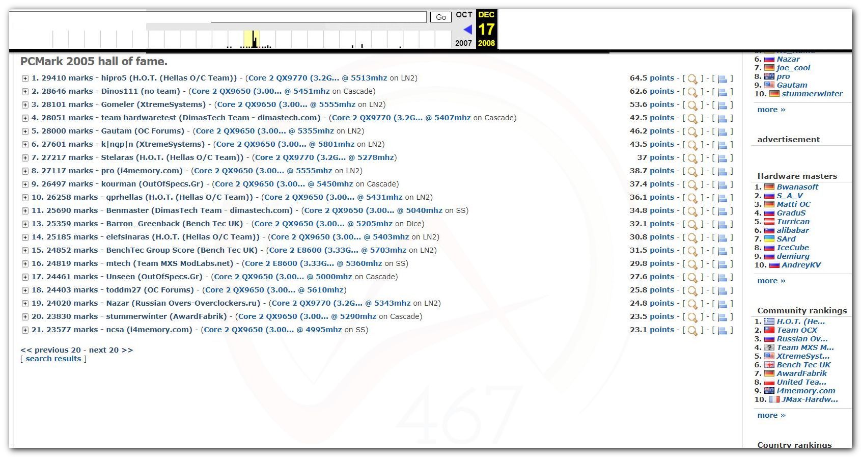 В 2000г. наверное самый бум наступил в момент появления 3DMark2000 и далее 2001, и создания базы этих результатов ORB на сайте MadOnion. В последствии перекочевала на Futuremark.