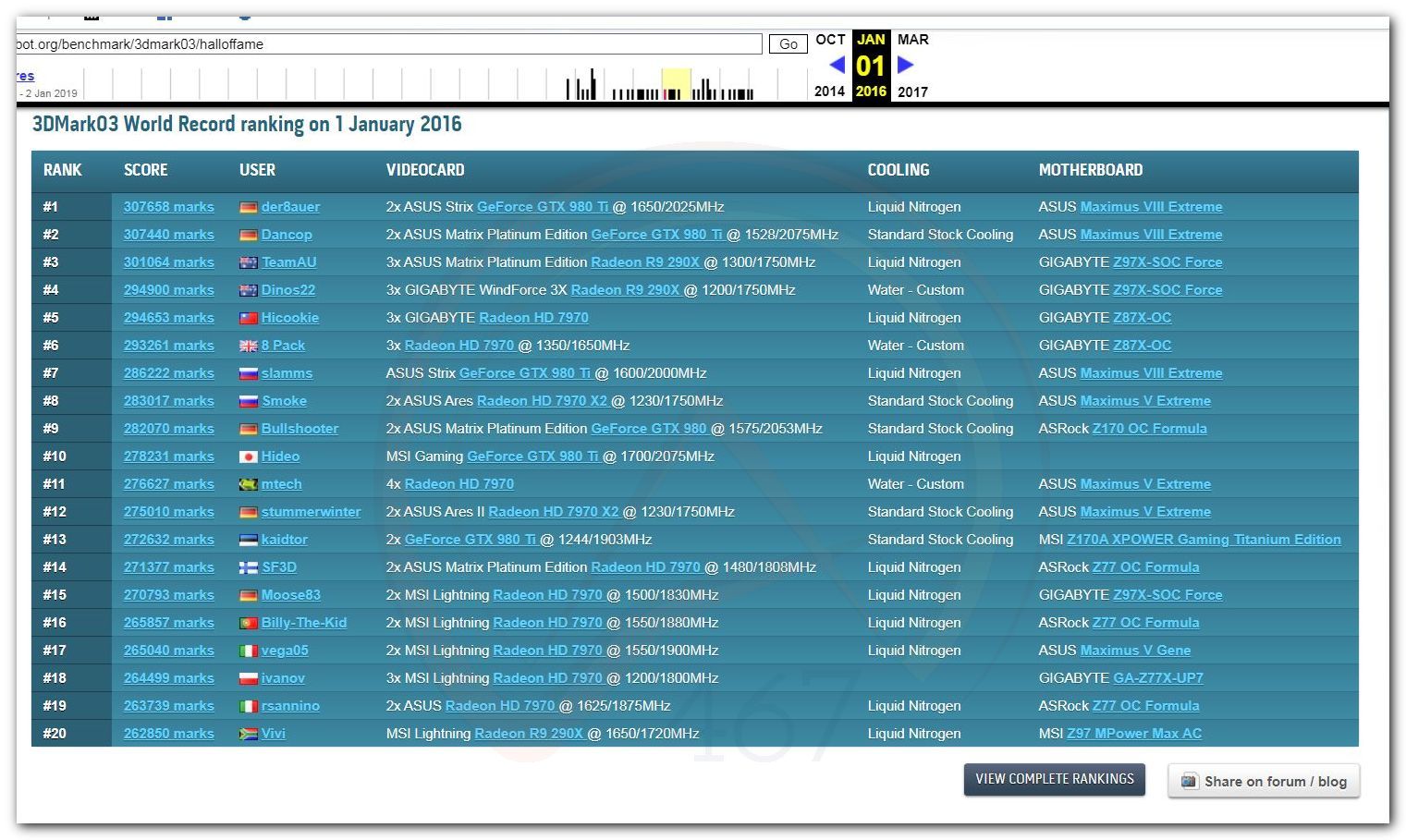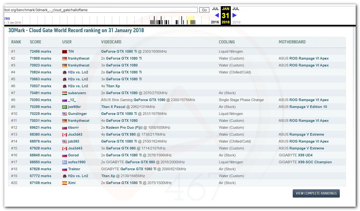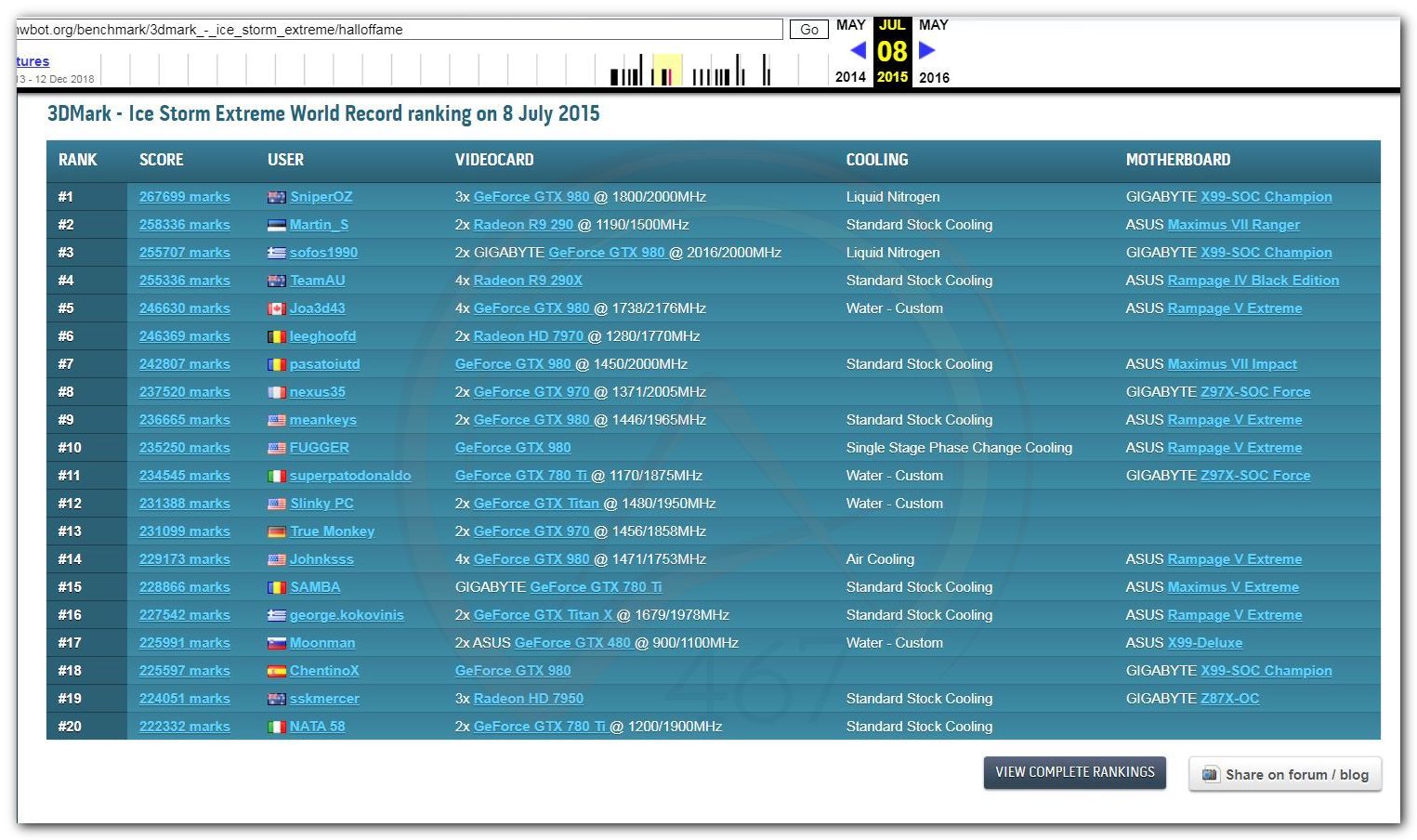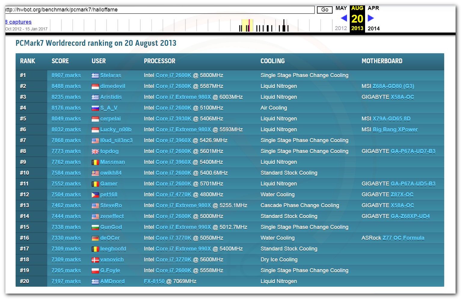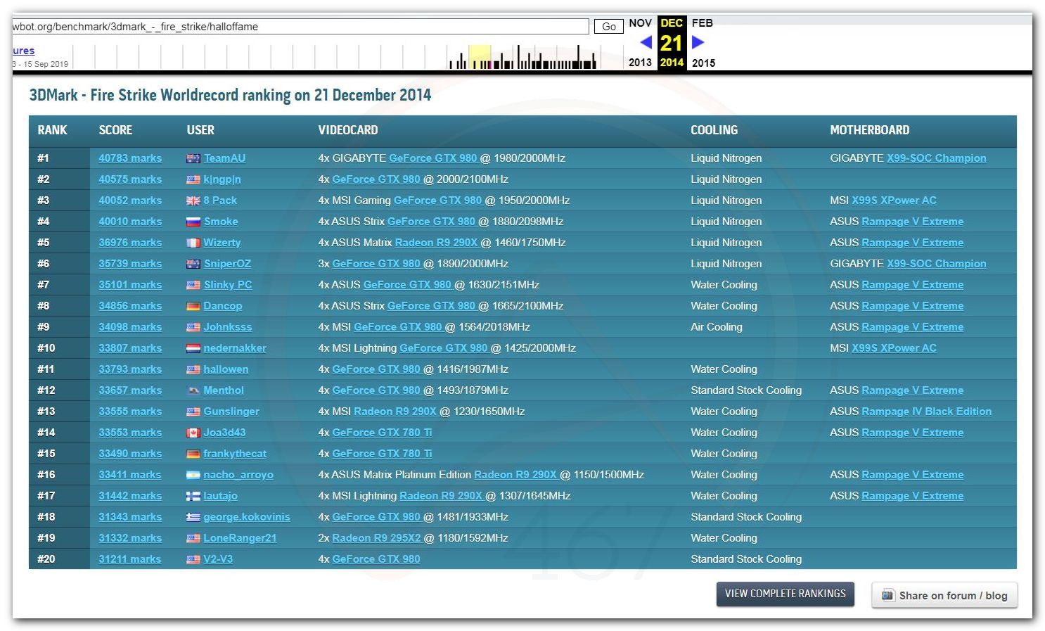 В 2000г. наверное самый бум наступил в момент появления 3DMark2000 и далее 2001, и создания базы этих результатов ORB на сайте MadOnion. В последствии перекочевала на Futuremark.