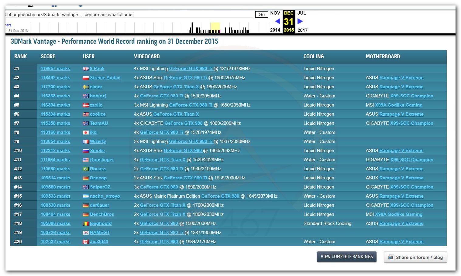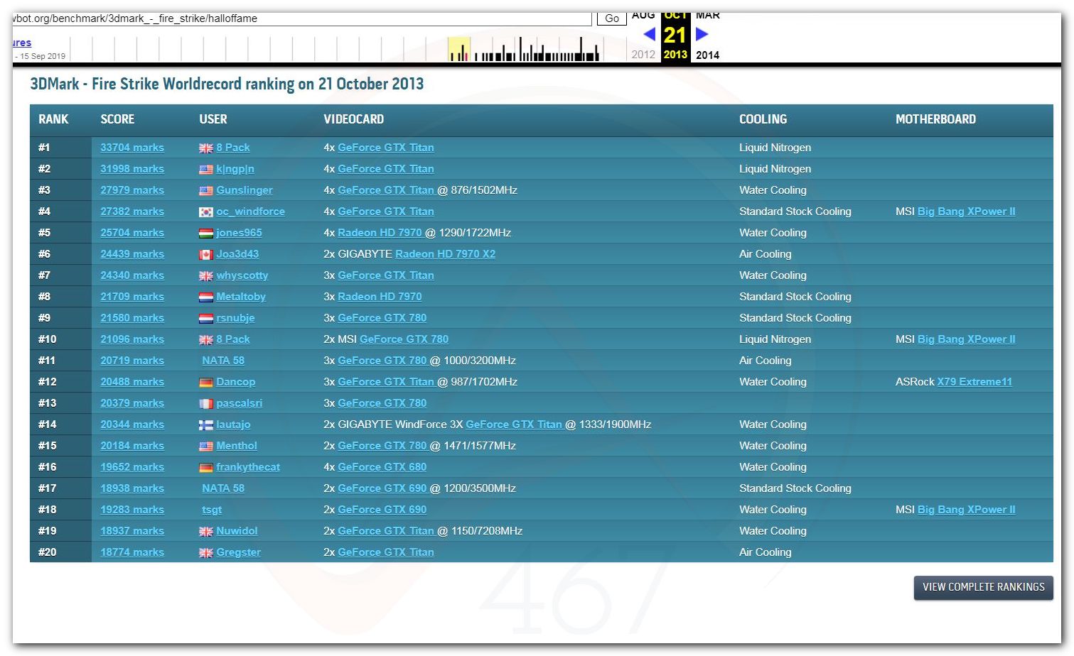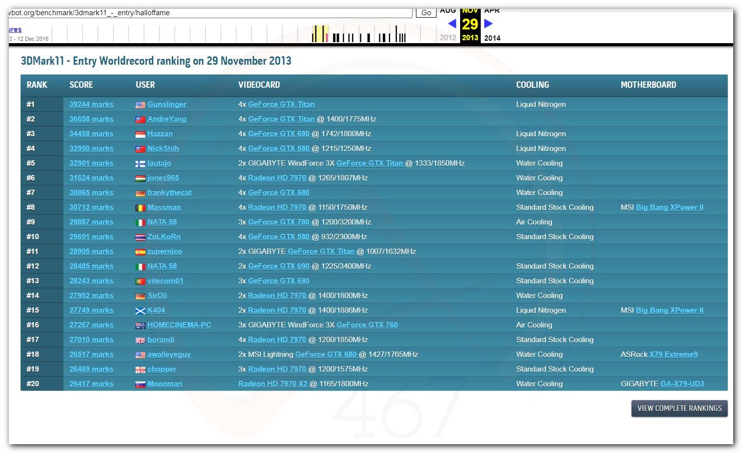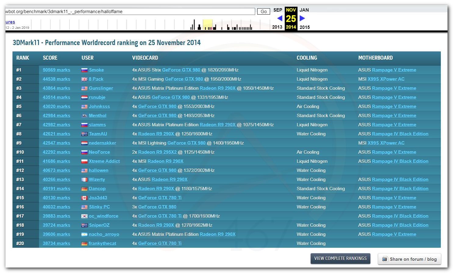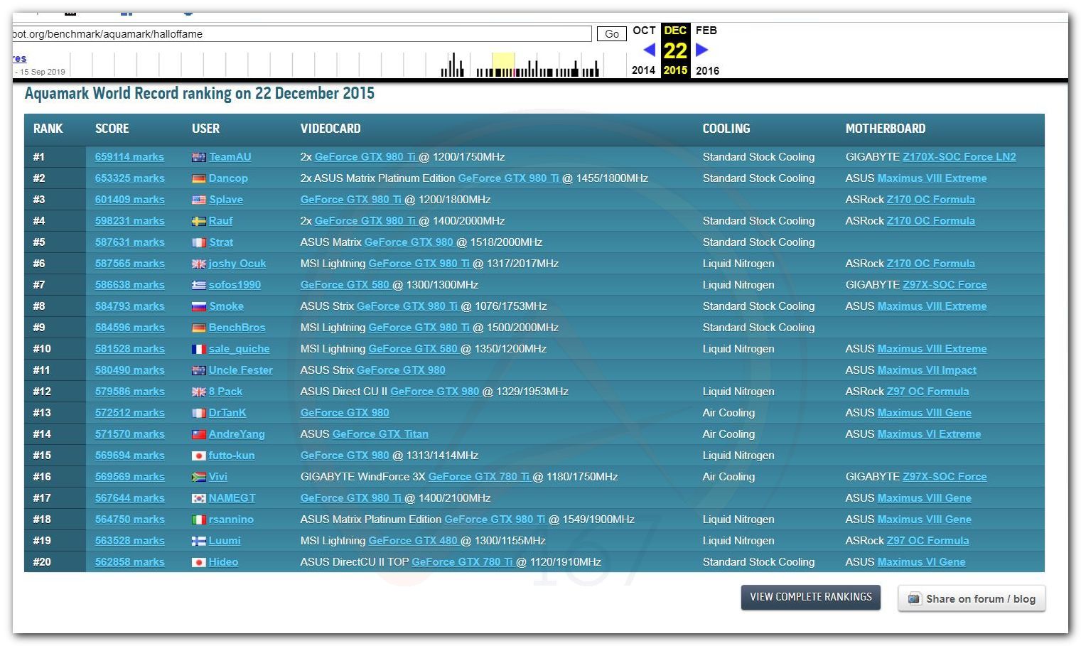 В 2000г. наверное самый бум наступил в момент появления 3DMark2000 и далее 2001, и создания базы этих результатов ORB на сайте MadOnion. В последствии перекочевала на Futuremark.