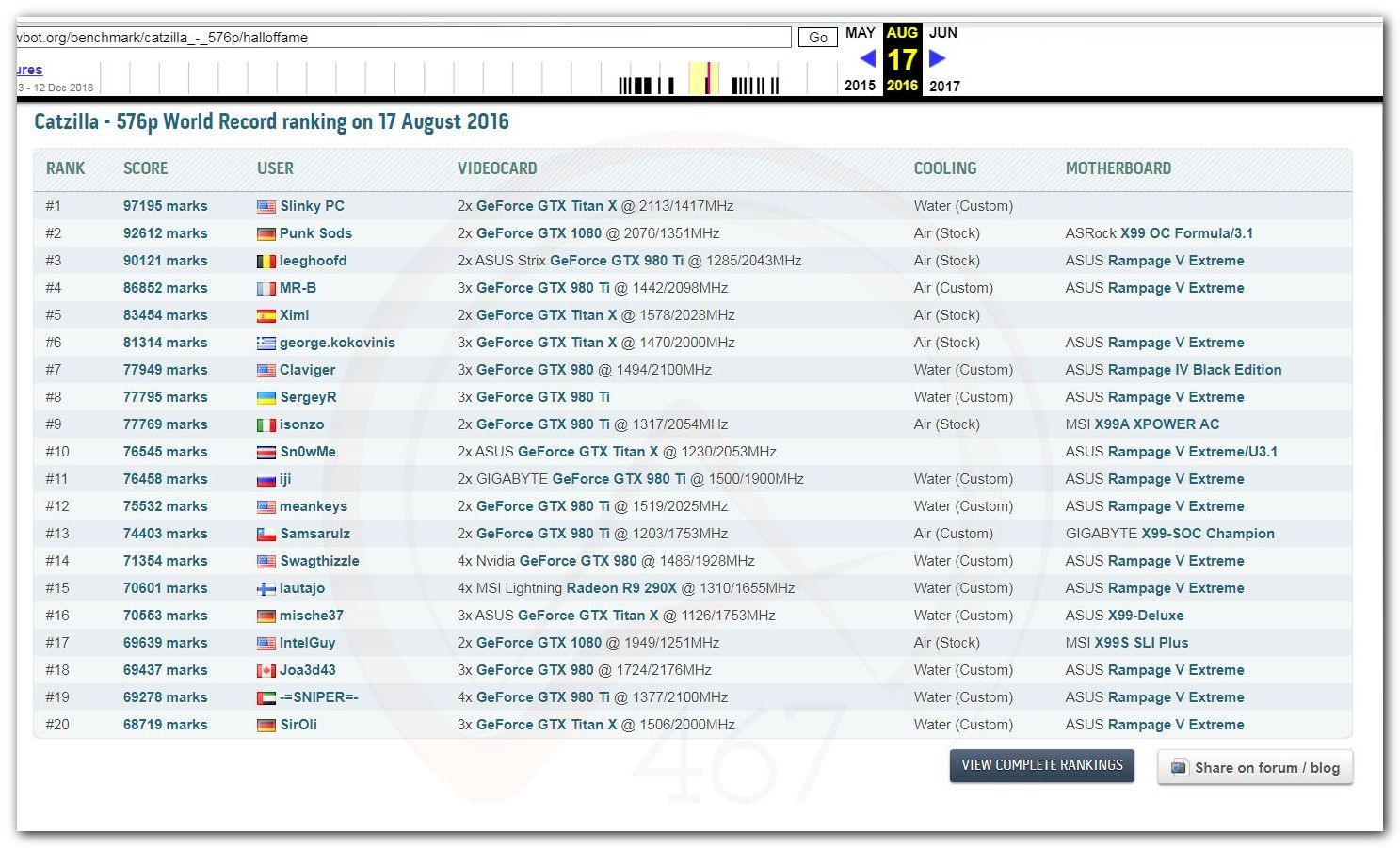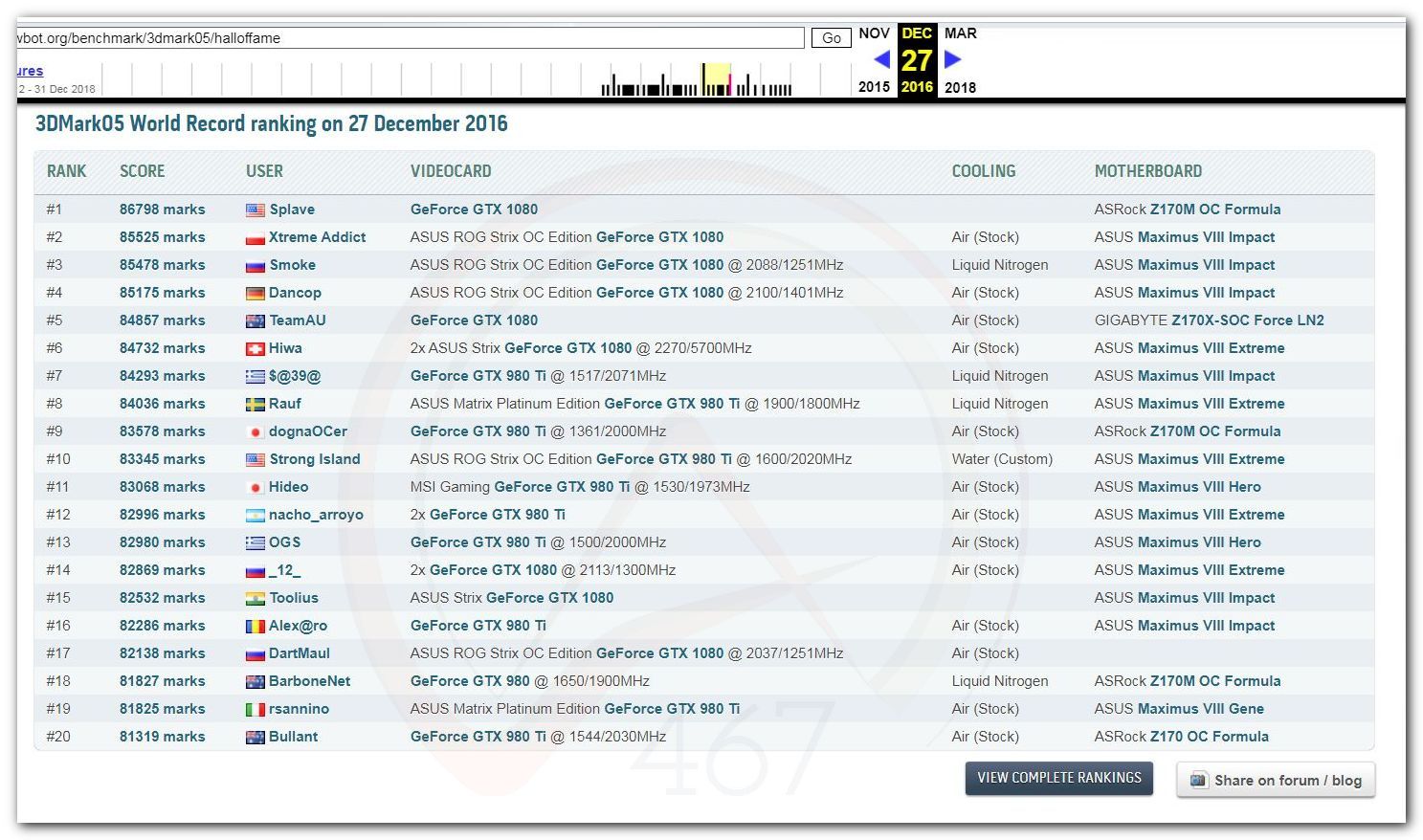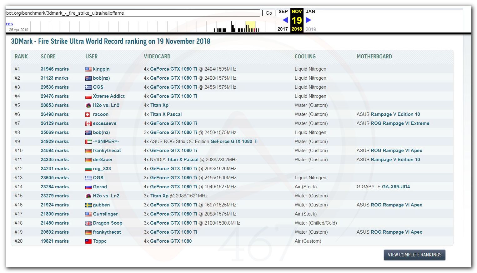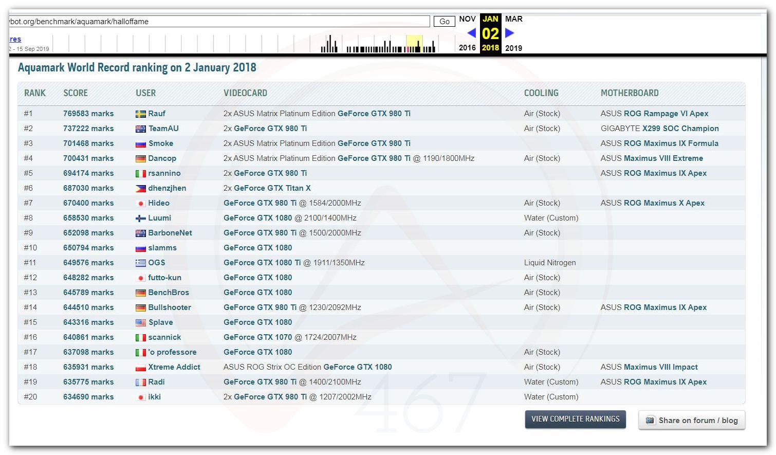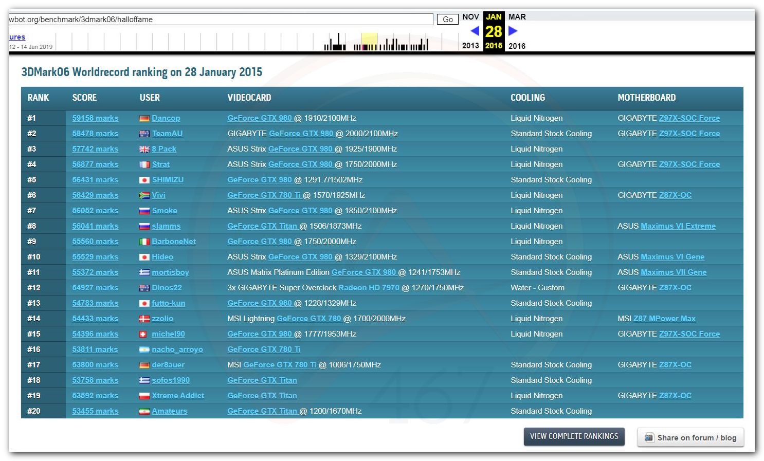 В 2000г. наверное самый бум наступил в момент появления 3DMark2000 и далее 2001, и создания базы этих результатов ORB на сайте MadOnion. В последствии перекочевала на Futuremark.