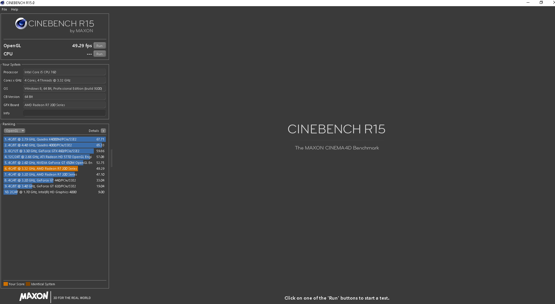 В Cinebench r15 карта показывает разные показатели по FPS, в разгоне даже доходя до r7 250
