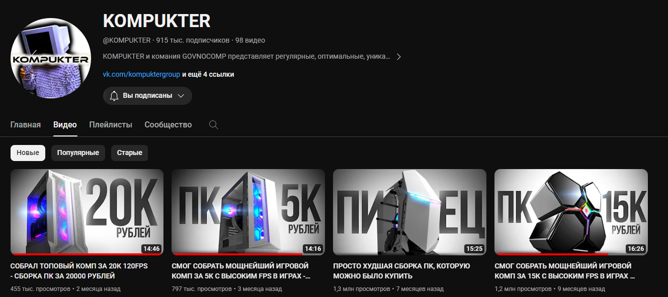 За что его любят и почему смотрят? Компуктер занимается в основном чисто сборками ПК, хотя раньше пытался хайпить на других именах, как нахваливая их, так и ругая. Парня любят за интересный подбор комплектующих, по-настоящему качественную съемку и монтаж. Видеоряд в его роликах может выступать в качестве рекламных материалов для каких-нибудь вендоров, настолько он чистый и вылизанный (в хорошем смысле). Иметь чувство стиля, способность грамотно подобрать аудиоряд не каждому дано. Помимо хорошего визуала, он обладает хорошим чувством юмора. Порой он выдаёт перлы, которых люди у других коллег по цеху в жизни бы не дождались. Да, последнее время он выпускает новые видео не так часто, но по ним видно, что простой канала не сказывается на их качестве.