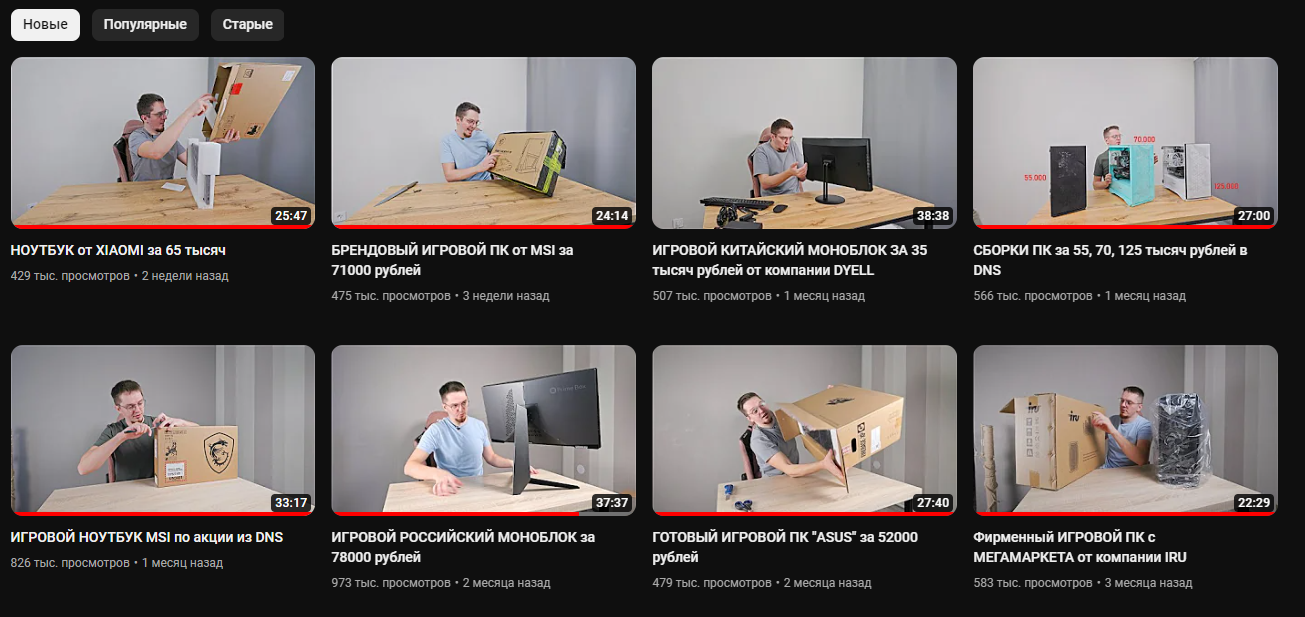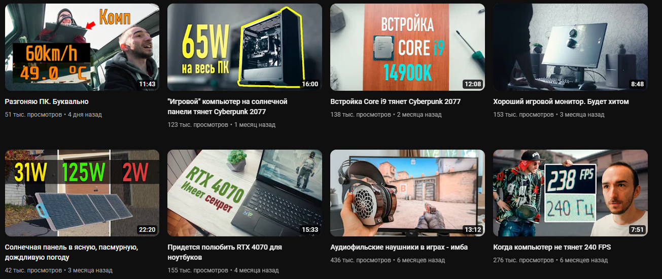 Также людям, только начинающим увлекаться компьютерной тематикой буду полезны некоторые "образовательные" видео. Такие, например, где он поясняет за герцовку в мониторах или описывает простыми словами принципы работы технологий масштабирования изображения от Nvidia, AMD и Intel. В основном сейчас он занимается сборками ПК и покупками "компа в мешке" в сетевых магазинах. Видно, что человек старается держать определенную планку, которую он достиг и придумывать новые форматы для своего канала.
