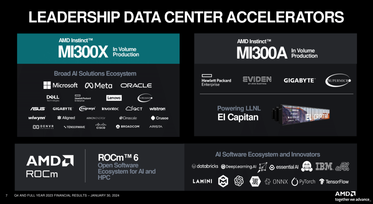 Во время конференции с инвесторами в первом квартале 2024 года (завершившейся 31 марта) генеральный директор AMD Лиза Су заявила, что более 100 корпоративных заказчиков и заказчиков искусственного интеллекта уже используют MI300X, включая некоторых из самых ценных клиентов Nvidia, таких как, например, Microsoft.