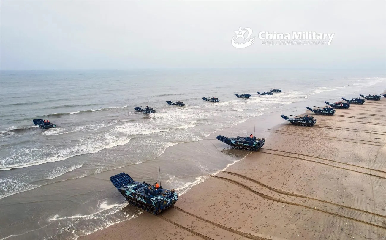 Архивное изображение: Бронемашины-амфибии, входящие в состав одной из бригад морской пехоты Народно-освободительной армии Китая, направляются в расчетную акваторию во время военно-морских учений 13 марта 2022 года. Фотография представлена онлайн изданием Euro AsianTimes
