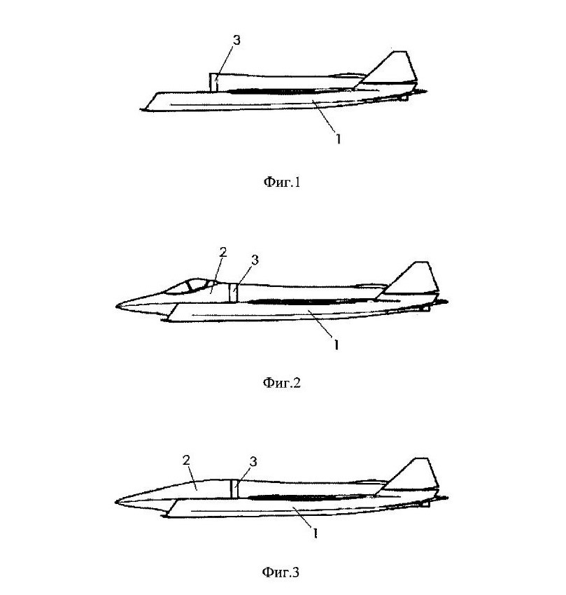 На схеме изображены базовая платформа и два сменных носовых отсека части перспективного истребителя. Патентный эскиз