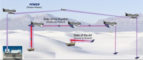 В своей статье для журнала Popular Mechanics, опубликованной в октябре 2022 года, Кайл Мизоками пишет, что электричество, вырабатываемое военными электростанциями, может быть преобразовано в лазерный луч. Далее этот луч направляется на беспилотник-ретранслятор, который передает его другим таким же дронам, до тех пор, пока последний БПЛА не перенаправит излучение на военный аванпост, где свет будет преобразован в электричество.