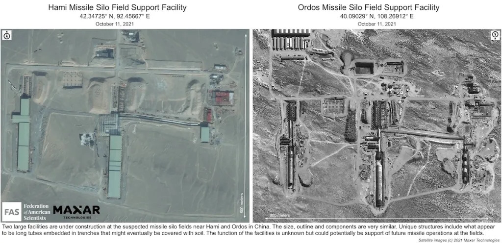 На территории предполагаемых ракетных шахтных полей вблизи Хами и Ордоса в Китае ведется строительство двух крупных объектов. Размеры, определяющие внешние очертания объектов и все детали очень похожи. Уникальные сооружения представляют собой длинные трубопроводы, уложенные в траншеи, которые со временем могут быть засыпаны землей. Назначение этих конструкций неизвестно, но потенциально они могут использоваться для обслуживания будущих операций с ракетами. Изображения полученны со спутника Maxar Technologios в 2021 году / Weapons and Strategy.